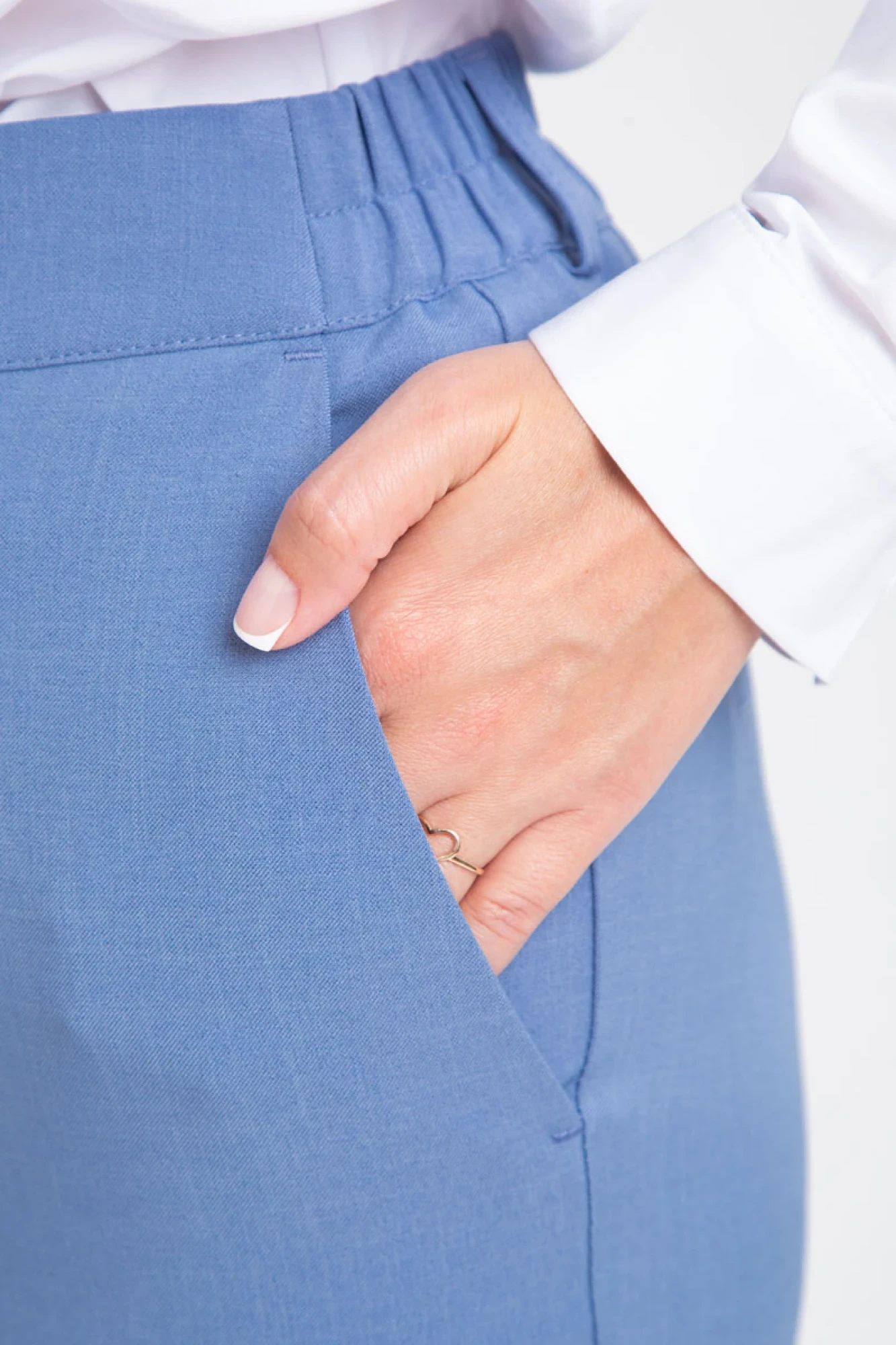 Притачной пояс со шлевками, по спинке пояс сосборен на резинку, что обеспечивает хорошую посадку на разных типах фигур. Застежка на молнию и пуговицу.