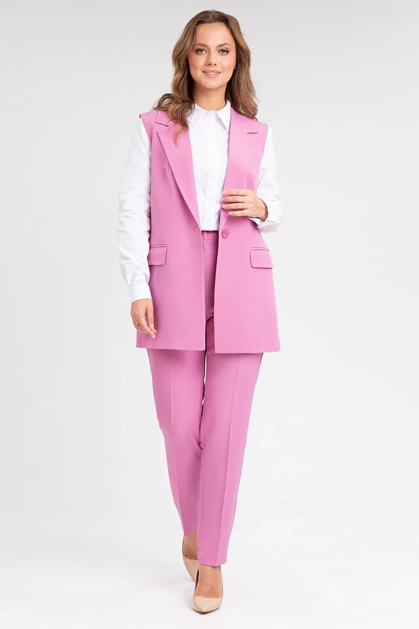 42,44,46, 48 , 50 , 52 , 54 , 56 , 58Удлиненный жилет полуприлегающего силуэта с однобортной застежкой на пуговицу. Отложной воротник с лацканами. Жилет с боковыми рельефами, спинка со средним швом. Спереди горизонтальные боковые карманы в рамку, с клапанами.