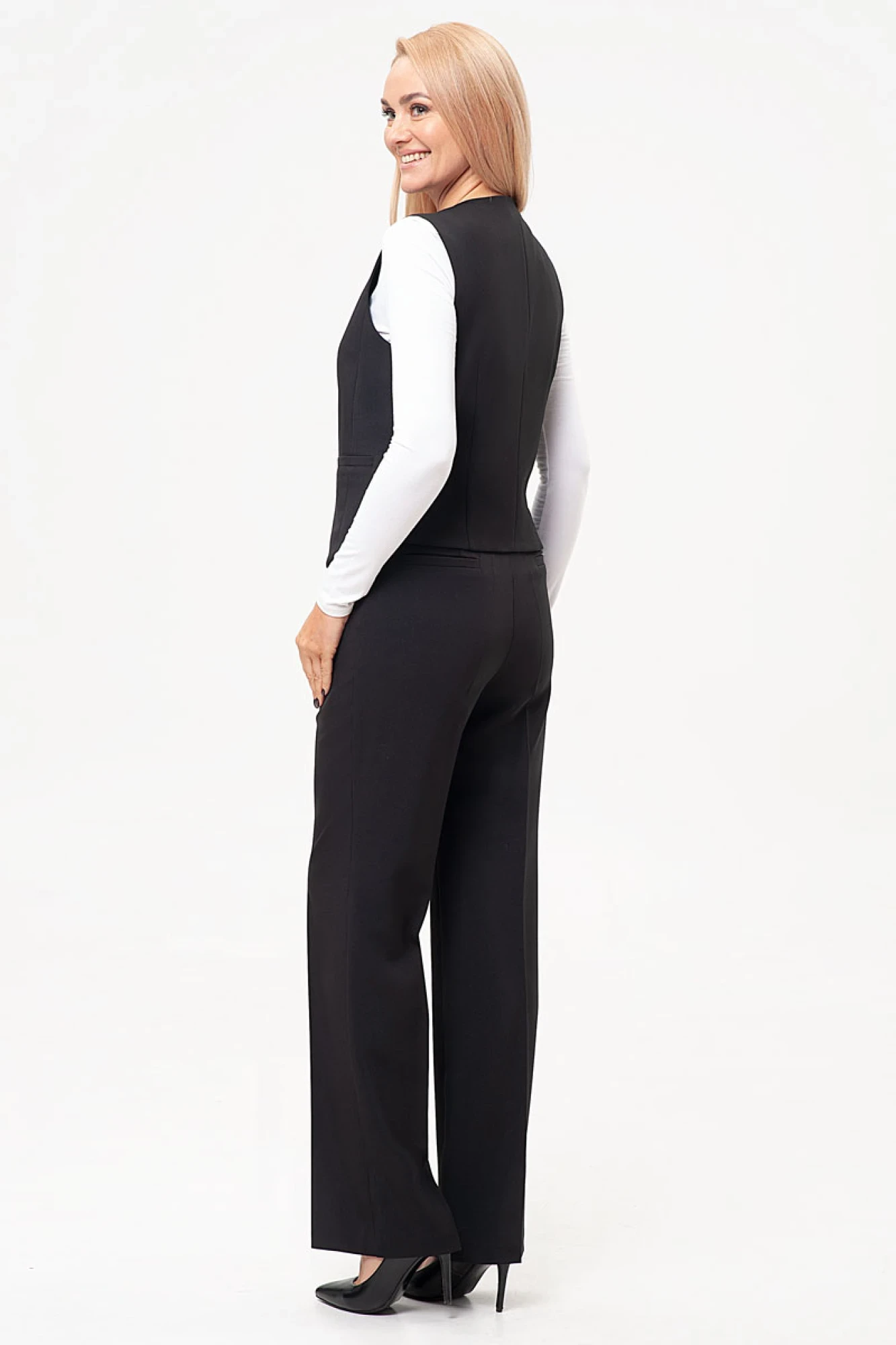Прямые от бедра брюки со стрелками. Высокая посадка на талии. Притачной пояс со шлевками, по спинке сосборен на резинку для комфортной посадки. Застежка на молнию и пуговицу. Спереди косые боковые карманы, по спинке имитация горизонтальных карманов с листочкой."