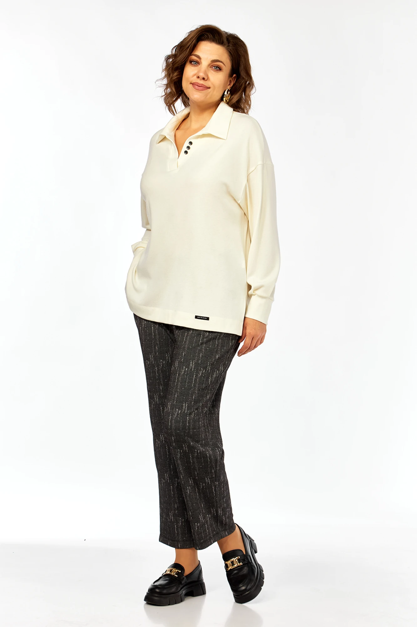 56Комплект брючный, двухпредметный, состоит из джемпера и брюк. Джемпер свободного силуэта изготовлен из трикотажного полотна. Горловина оформлена отложным воротником и планками, декорированными пуговицами. Рукава спущенные, по низу обработаны манжеты. В боковых швах разрезы. Декоративный элемент — нашивка. Брюки из трикотажного полотна, свободного кроя. Пояс на резинке. На передней части накладные карманы. Отделка закрепки.
