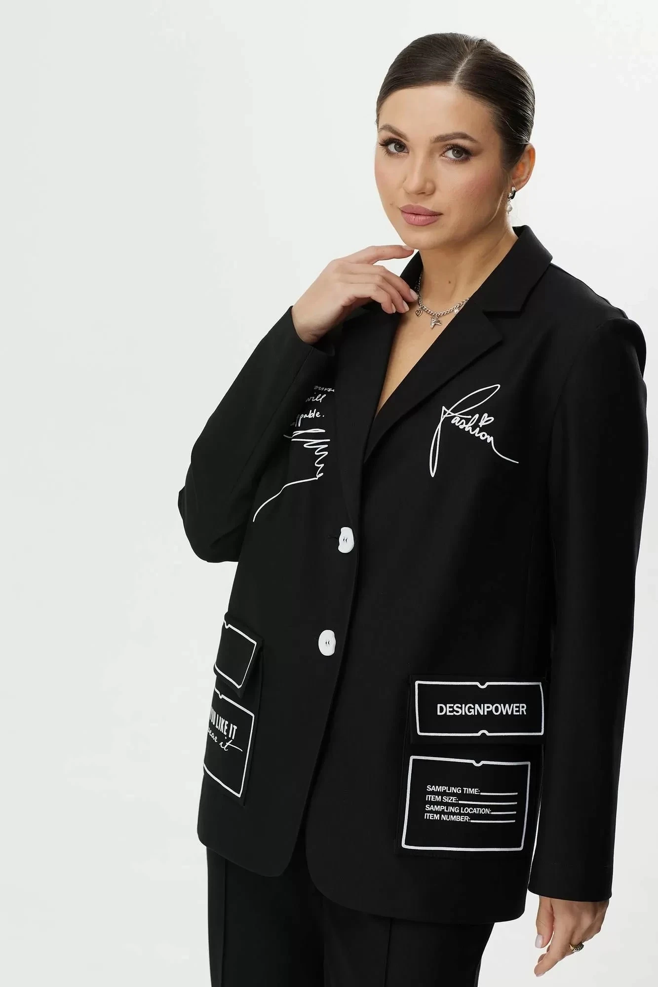 44,46, 48 ,50,52,54Жакет с центральной бортовой застежкой на петли и пуговицы. Перед жакета с нагрудными вытачками и рельефами, настрочены накладные карманы с клапанами. Перед декорирован авторской печатью. Спинка со средним швом. Плечо спущено. Рукав длинный, двухшовный.