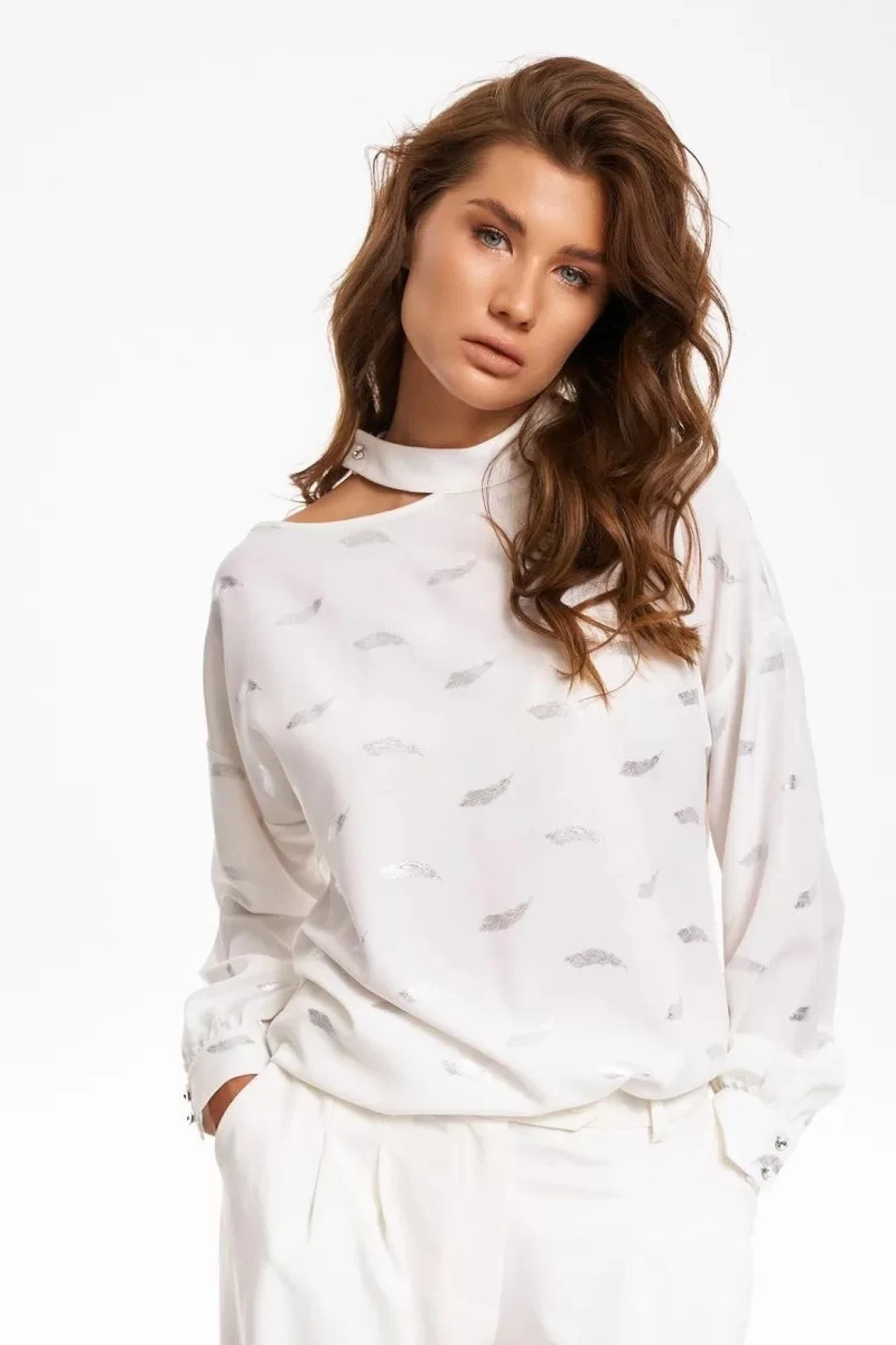 На передних половинках брюк по линии талии заложены две односторонние складки, направленные в сторону бокового шва и функциональные карманы с отрезным бочком.