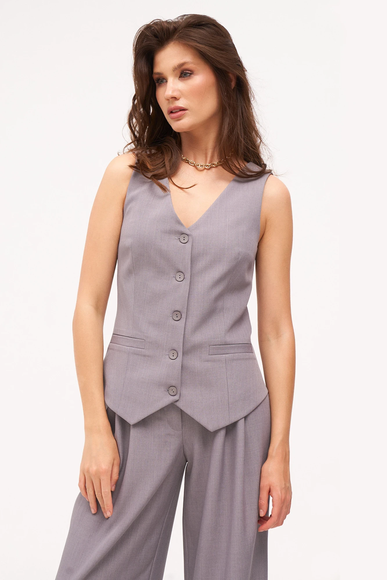 44, 46 , 48 ,50, 52 , 54Спинка с талиевыми вытачками. Жилетка на притачной подкладке. Застежка центральная, на прорезные петли и пуговицы. Длина жилетки до уровня линии бедер. Брюки женские большого объема, прямого силуэта, вида «палаццо». На передних половинках брюк по линии талии заложены две
