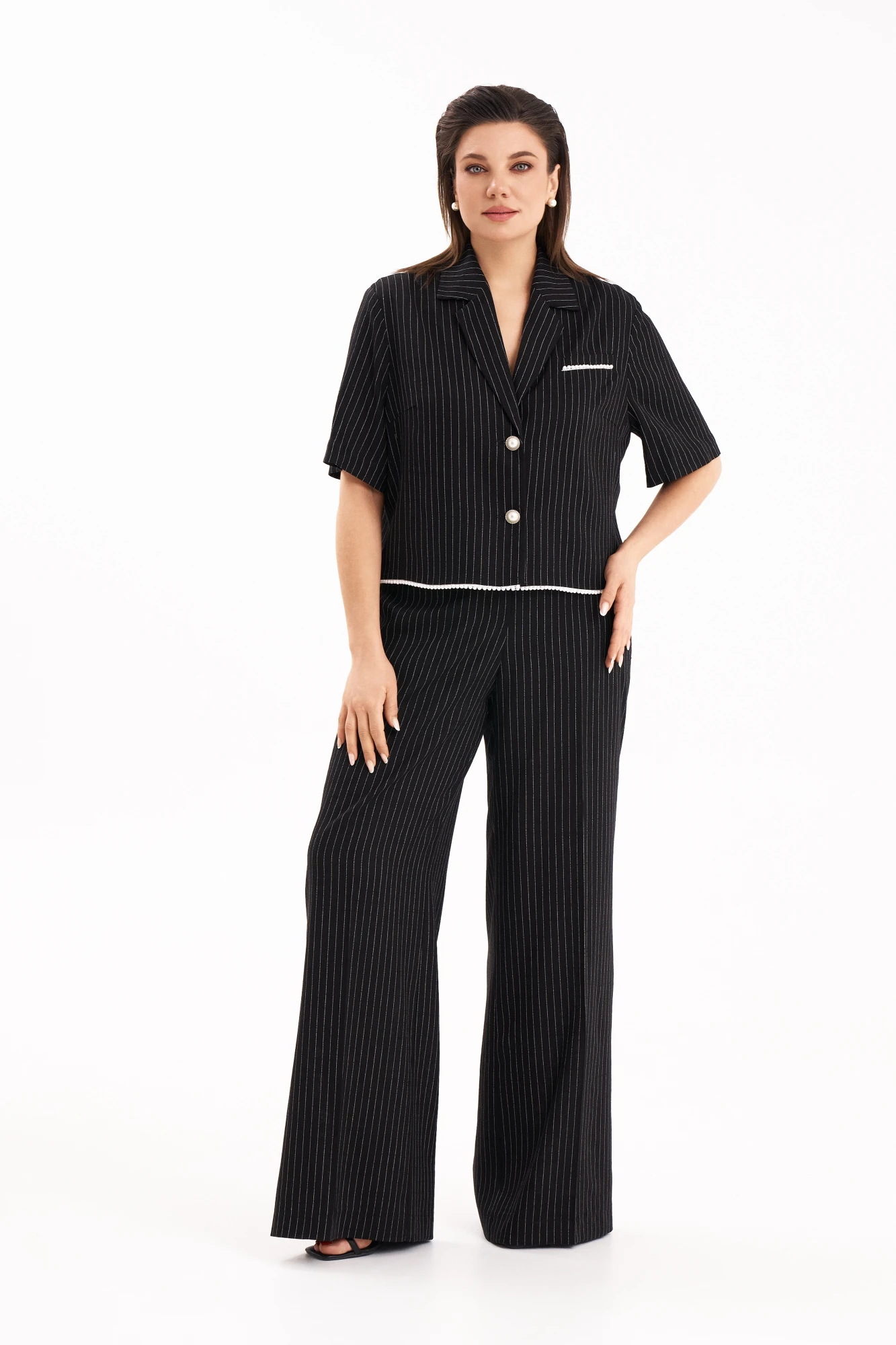 Жакет на хлопковой подкладке с мягкой линией плеча и рукавом до локтя. Низ изделия и листочка на груди обрамляются декоративной тесьмой с жемчугом. Застёжка спереди на две пуговицы. "