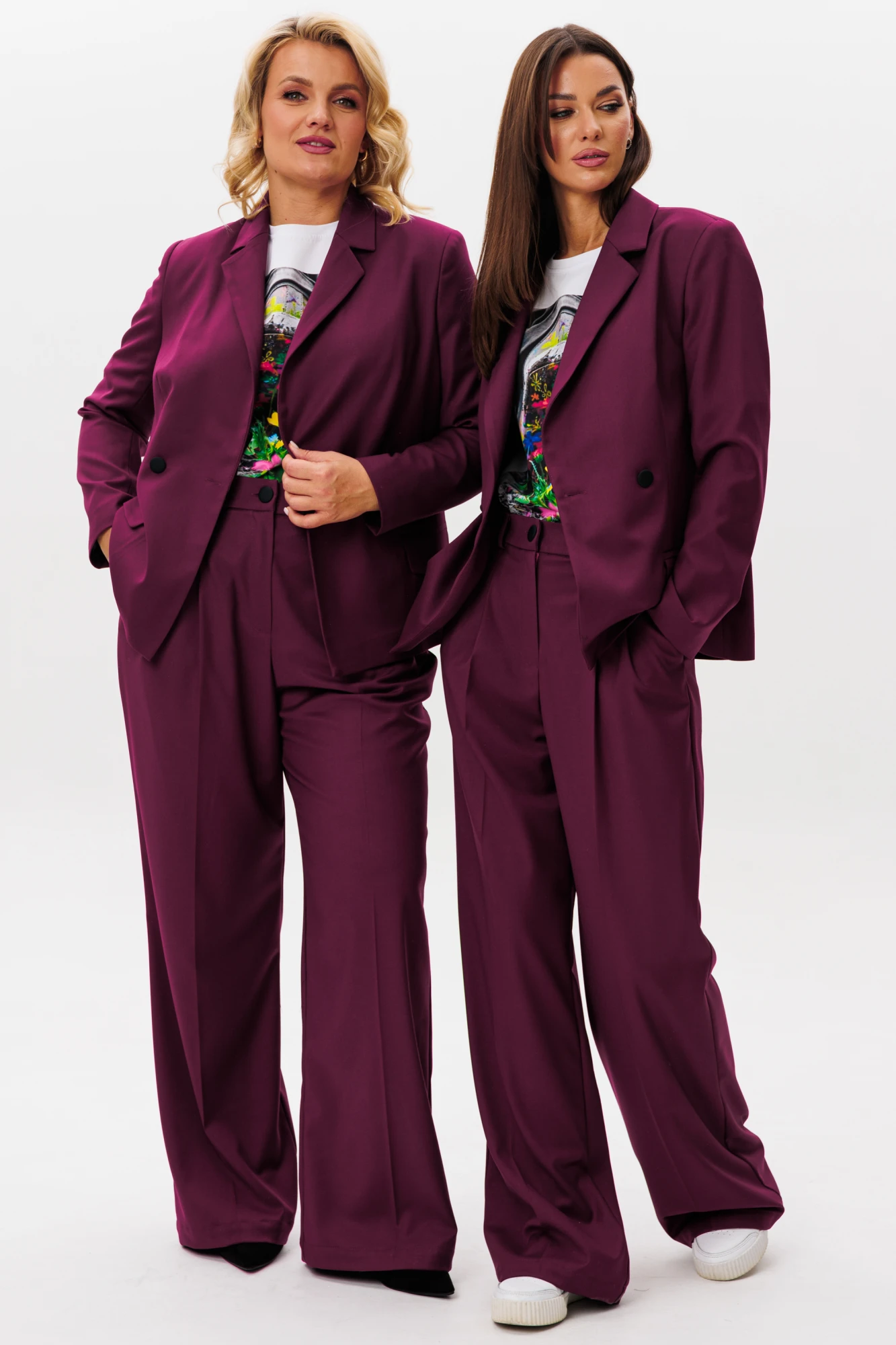 Идеальный выбор для создания утонченного образа — классический костюм, объединяющий двубортный жакет с английским воротником и брюки палаццо свободного силуэта. Жакет выполнен из костюмной ткани с деликатным мерцанием стразов, добавляющих образу нотки роскоши. Модель отличается строгим английским воротником, прорезными карманами в рамку с клапанами, которые подчеркивают лаконичность дизайна, и двубортной застежкой, гарантирующей идеальную посадку по фигуре.