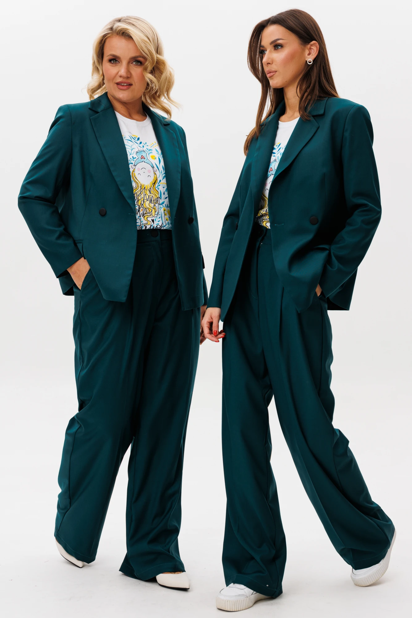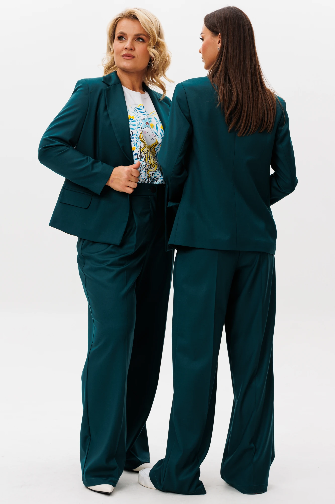 Идеальный выбор для создания утонченного образа — классический костюм, объединяющий двубортный жакет с английским воротником и брюки палаццо свободного силуэта. Жакет выполнен из костюмной ткани с деликатным мерцанием стразов, добавляющих образу нотки роскоши. Модель отличается строгим английским воротником, прорезными карманами в рамку с клапанами, которые подчеркивают лаконичность дизайна, и двубортной застежкой, гарантирующей идеальную посадку по фигуре.