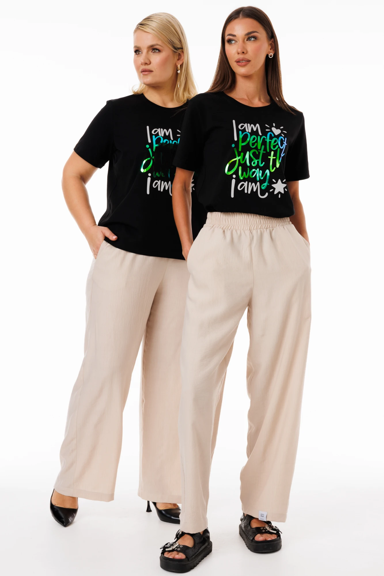 Брюки прямого кроя дополняют комплект универсальностью: свободный силуэт и функциональные карманы, встроенные в боковые швы, делают их идеальными для офиса, прогулок или встреч. Оба предмета сшиты из воздушной жатой вискозной ткани, которая не мнется в носке, сохраняет форму и приятна к телу.