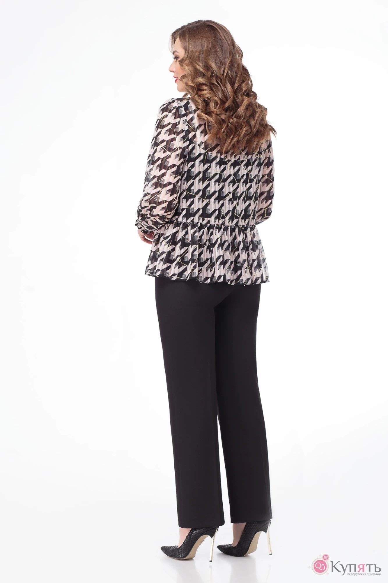 Комплект состоит из блузы и брюк.Блуза-из шифона,по переду и спинке фигурная кокетка.По низу блузы волан со сборкой.Рукав вточной,длинный,низ рукава собран на эластичную тесьму.Блуза частично на подкладке.Брюки классические.