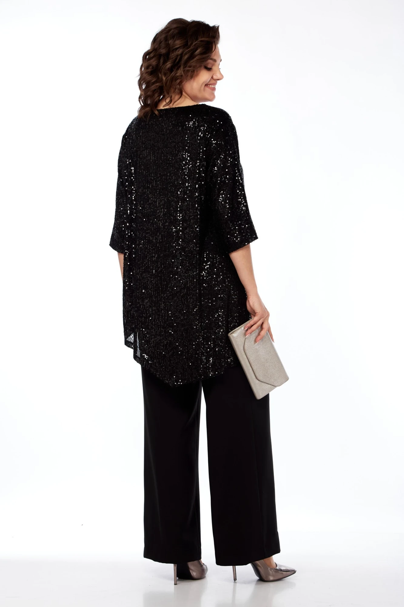 Туника выполнена из ткани в пайетки, свободного силуэта, вырез горловины округлый. Рукав втачной одношовный, длиной 3/4. Низ туники по полочке и по спинке с двумя асимметричными углами. Спинка цельная, без среднего шва. Туника и рукава туники на подкладке.