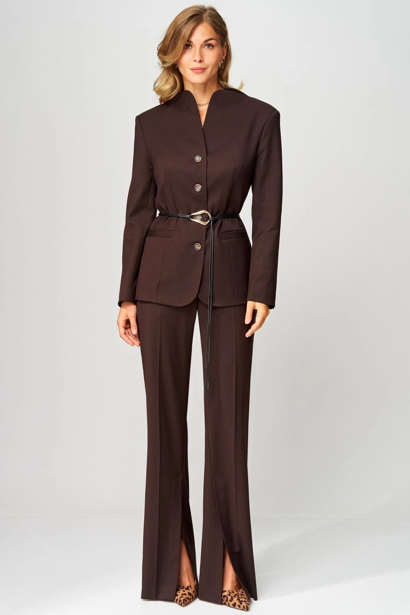Жакет полуприлегающего силуэта с центральной застежкой на 4 петли и 4 пуговицы. Вырез горловины жакета фигурной формы. Детали переда жакета с отрезными бочками и вертикальными нагрудными вытачками. Карманы горизонтальные прорезные с листочками с втачными концами. Деталь спинки жакета со средним швом, отрезными бочками и рельефными швами. Рукава втачные двухшовные, по локтевым швам вставлена планка, по низу декоративно прикреплены по 4 пуговицы. Жакет с притачной понизу подкладкой. Съемный пояс в комплекте.