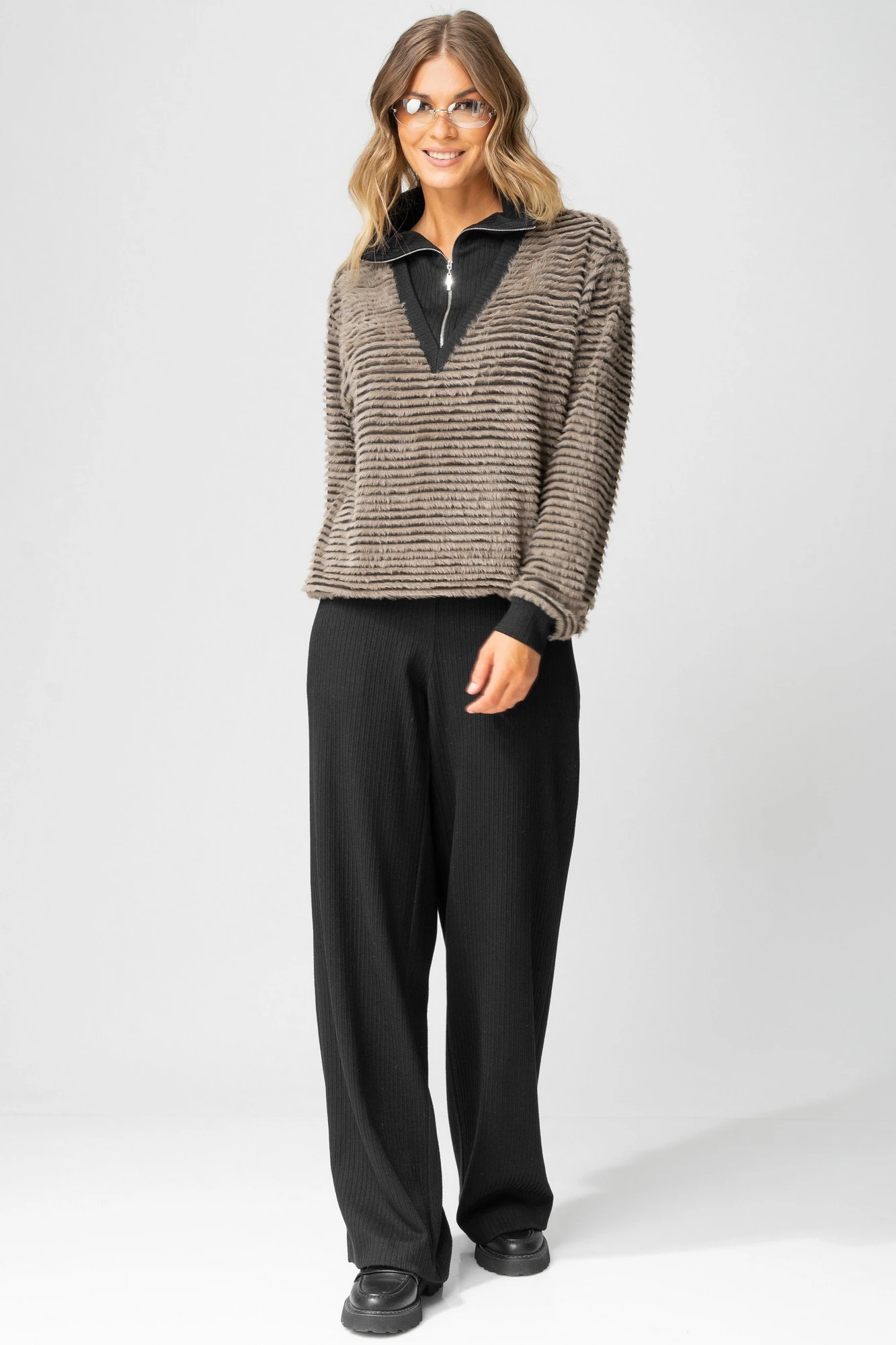 Джемпер длиной до линии бедер. Вырез горловины джемпера по переду «V-образной» формы, с втачным воротником с застежкой на декоративную тесьму-молнию. Спинка цельная. Рукава втачные одношовные, с притачными манжетами. Линия плача спущена. По низу джемпера идет притачная планка контрастного цвета.