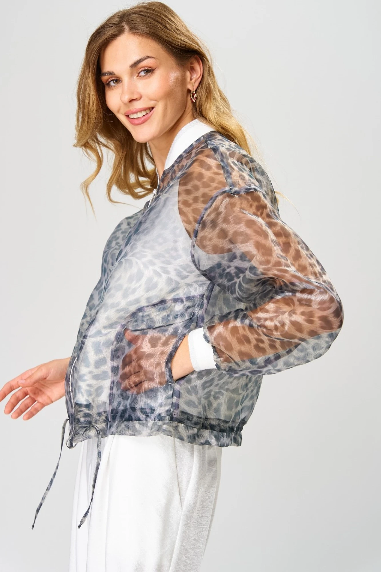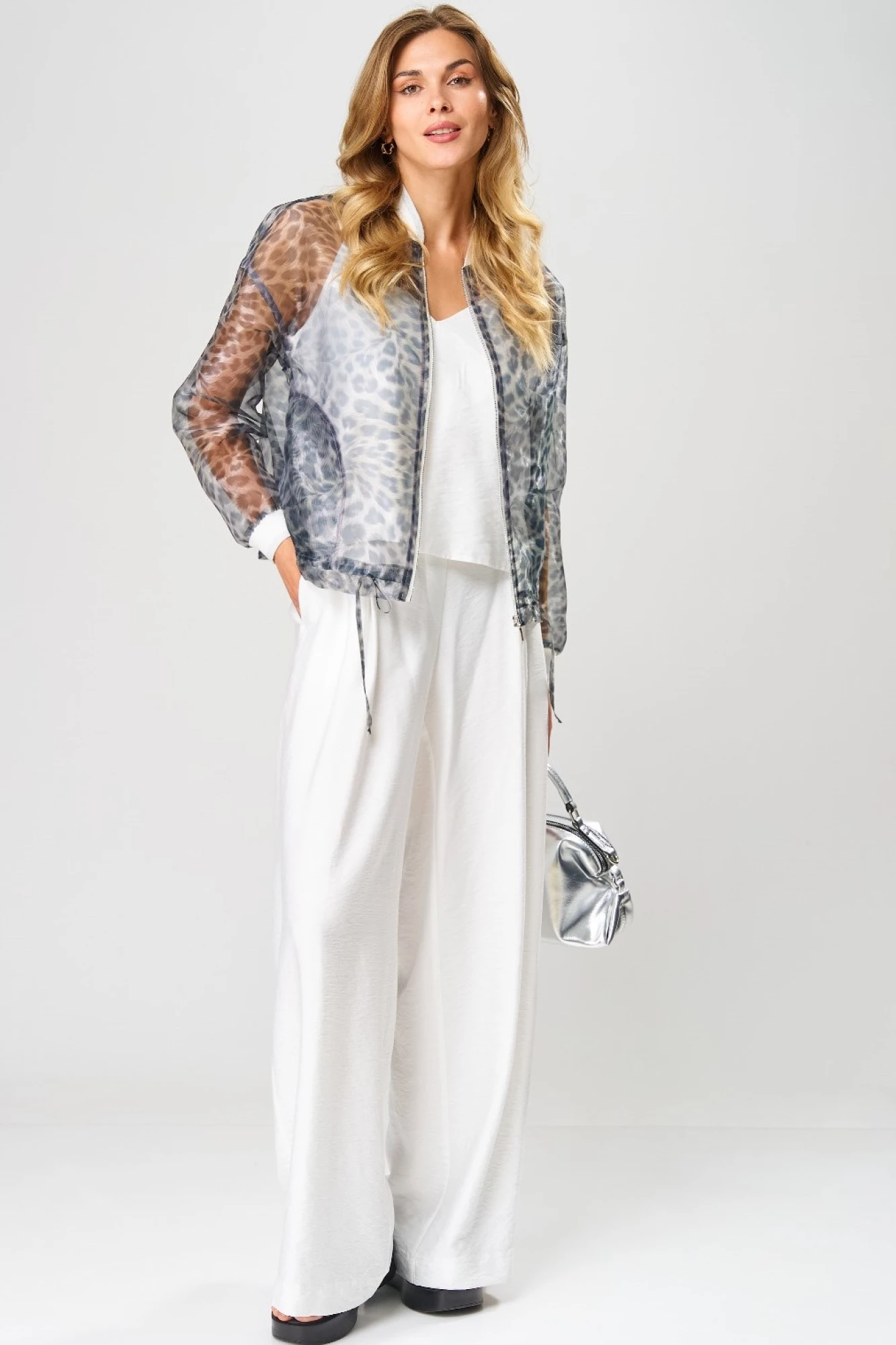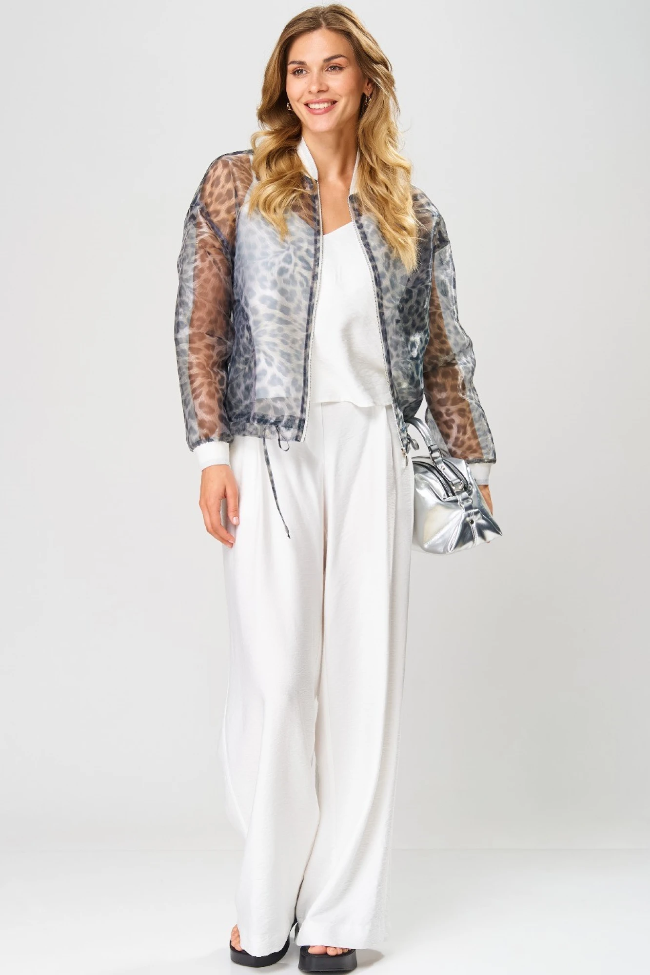 Брюки свободного силуэта расширеные к низу из вискозной ткани, с притачным поясом, в который частично вставлена эластичная тесьма. На передних половинках брюк в боковых швах обработаны наклонные карманы, по шву притачивания пояса заложены складки.Бомбер: длина рукава – 48см, ширина рукава – 24см, длина спинки – 56,5см.