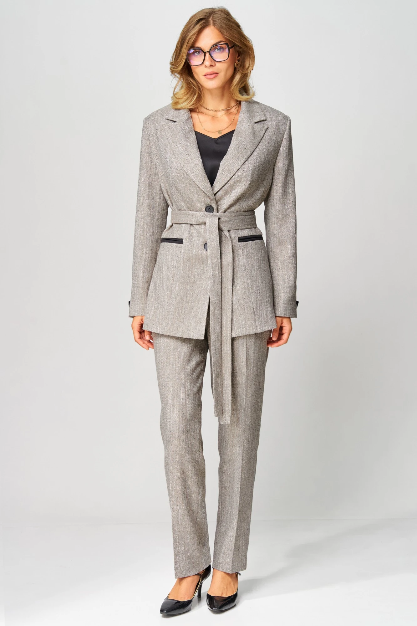 Жакет свободного силуэта, на подкладке. Воротник отложной пиджачного типа, застежка центральная на 2 петли и пуговицы. Перед жакета талиевыми вытачками от низа, с горизонтально расположенными боковыми прорезными карманами с листочками. Спинка с рельефными швами. Рукава втачные двухшовные, внизу обработан разрез и декоративно прикреплены «паты» с застежкой на 2 пуговицы. В компекте пояс из основной ткани.