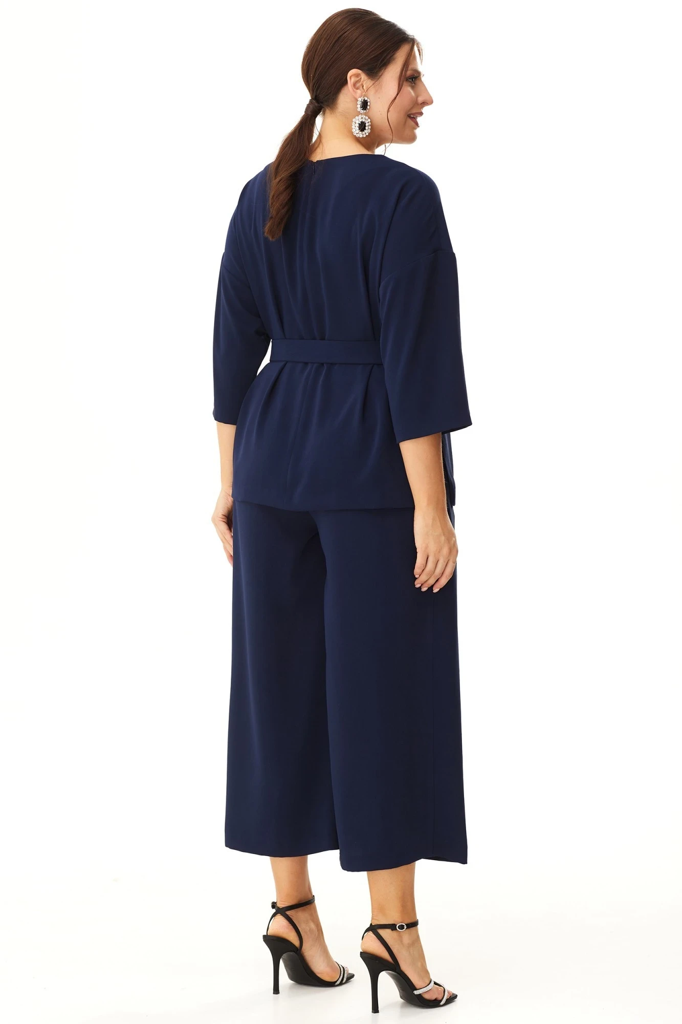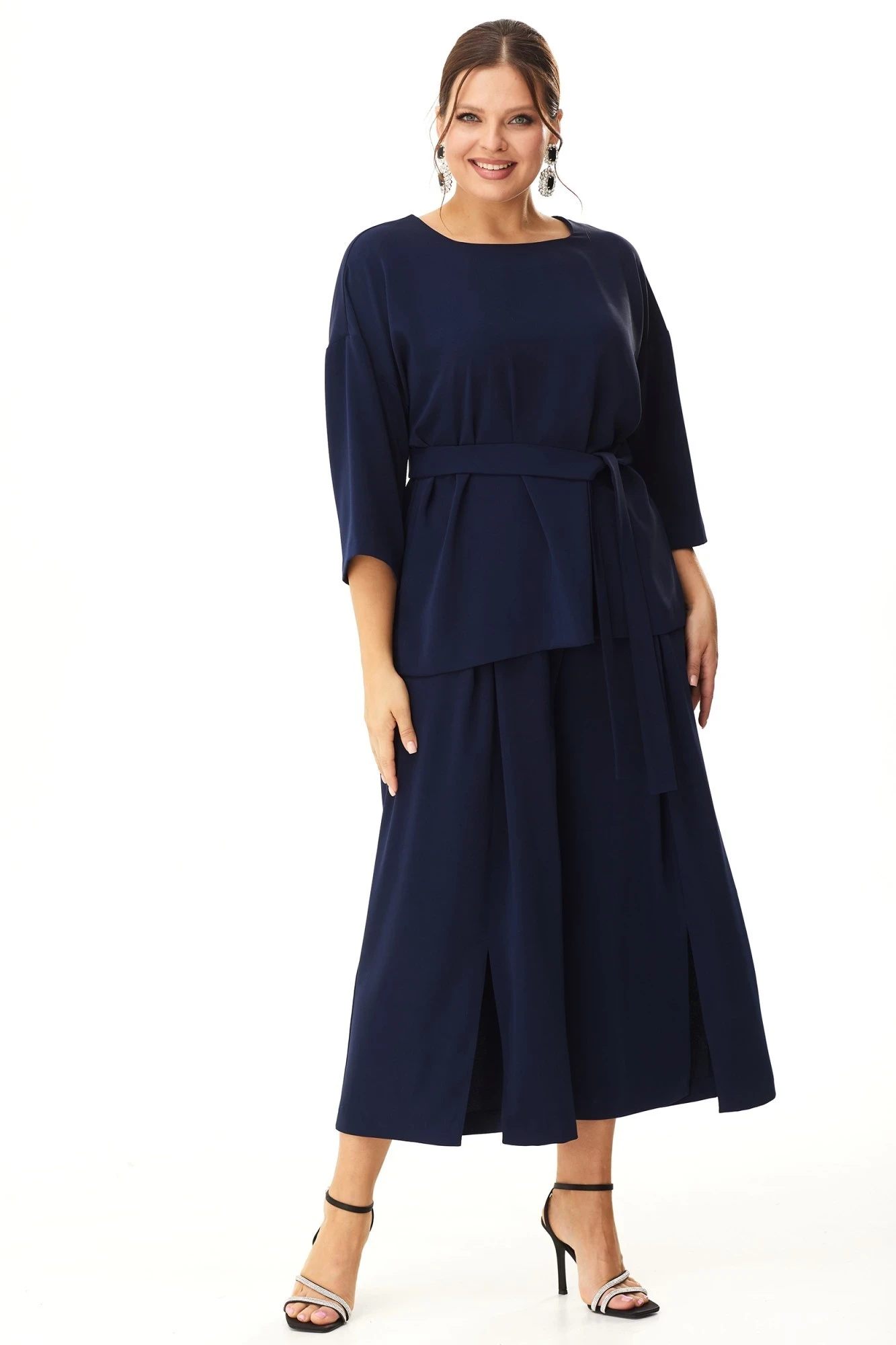 Комплект выполнен из плотной шелковистой ткани. Туника средней длины, свободного силуэта, линия плеча приспущена, по спинке шов и застежка «молния», по боковым швам – разрезы. Рукав 3/4, съёмный пояс подчёркивает линию талии. В этом комплекте именно брюки привлекают внимание: прямые, укороченные, впереди с глубокими встречными вставками и кокетливыми разрезами, силуэтом больше напоминающие юбку. У боковых швов внутренние карманы. Брюки оформлены поясом (по бокам резинки), застежка «молния» + пуговица.