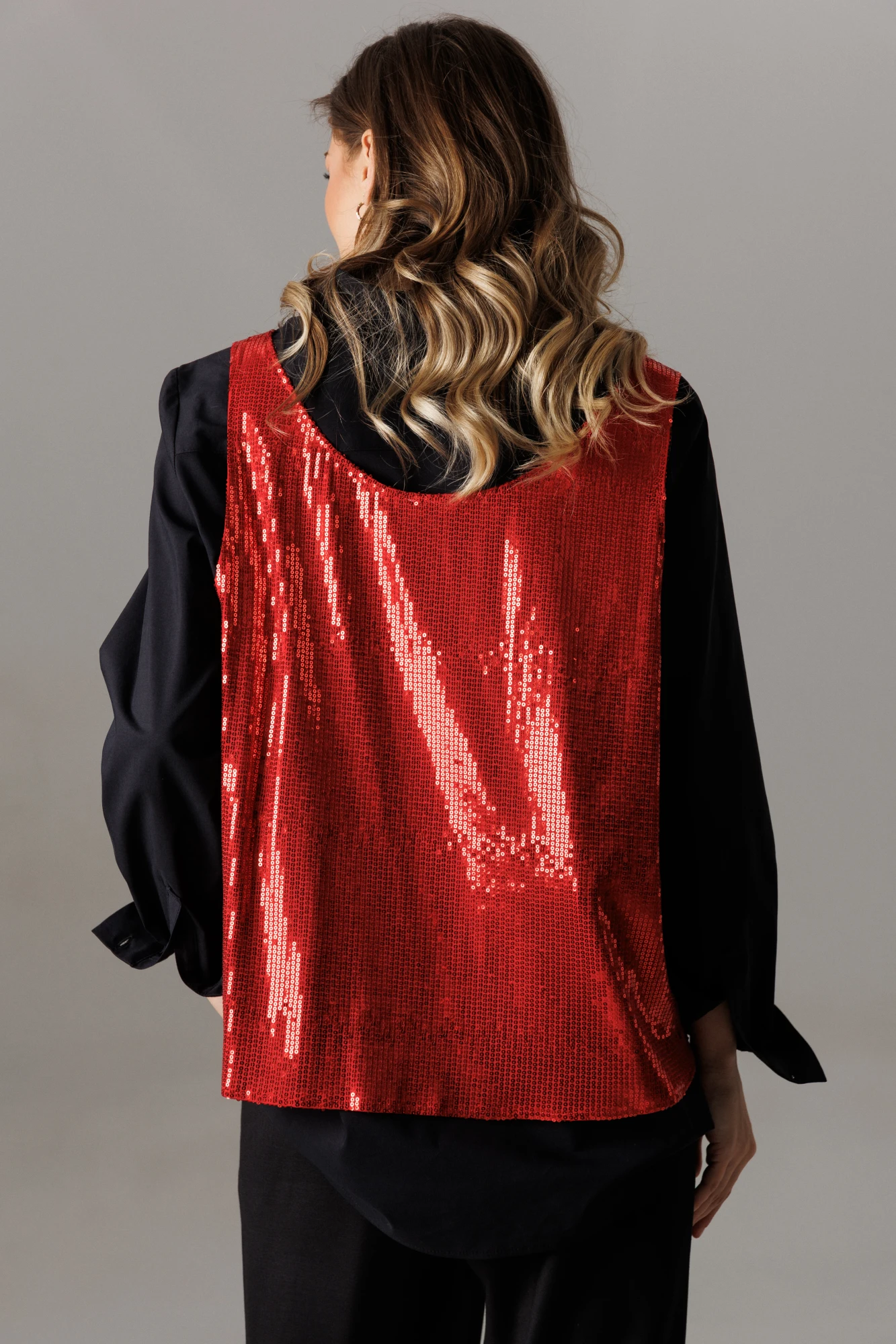Майка выполнена из трикотажного полотна с пайетками свободного прямого силуэта в стиле оверсайз. Спереди и сзади имеет глубокие овальные вырезы и удлиненную линию проймы. Майка съемная. Длина изделия от плечевого шва по спинке 62 см.