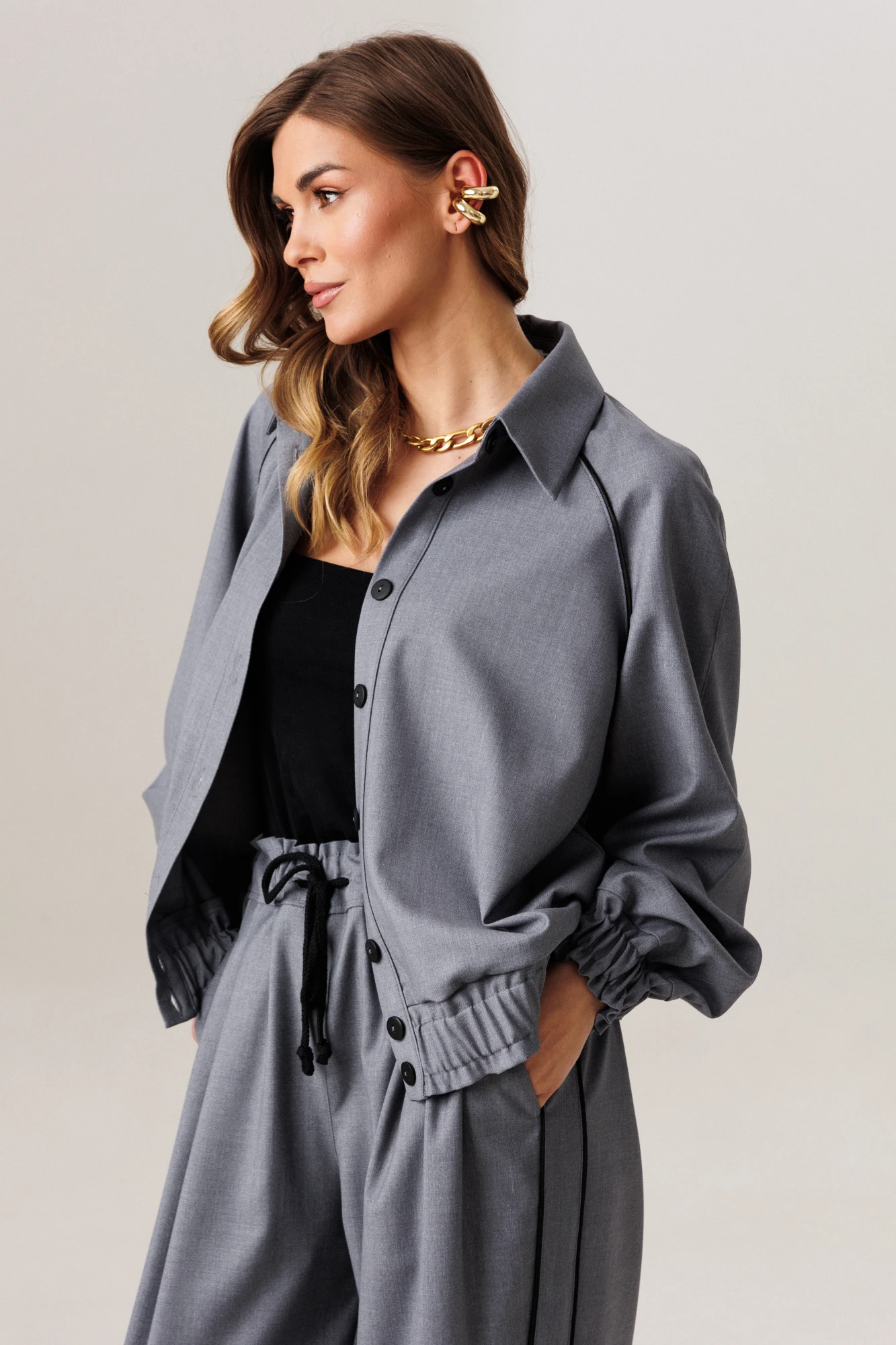 Блузон, прямого свободного силуэта на притачном поясе с эластичной тесьмой внутри. Рукав-двухшовный реглан, к низу которого притачен манжет с эластичной тесьмой внутри, которая создает эффект сборки в стиле буф. Длина рукава с плечевой линией и манжетом 75-78 см (в зависимости от размерного ряда). По линии притачивания рукава (спинка и полочка) вставлен кант контрастного тона, который зафиксирован отделочной строчкой, также на спинке, в качестве декоративного элемента расположена нашивка, в тон канта. Спереди блузона притачены вертикальные планки для функциональной застежки на петли/пуговицы, шириной по 3 см. Горловина изделия округлая, с отложным рубашечным воротником на стойке. Длина изделия по спинке 62-64 см.