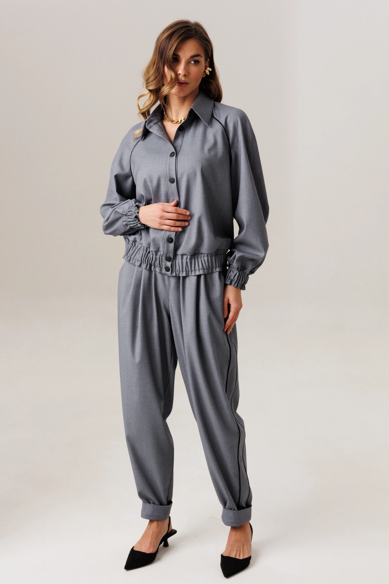 Оканчиваются брюки легкой сборкой и притачным манжетом-отворотом. Длина брюк по боковому шву с отворотом 100 см.