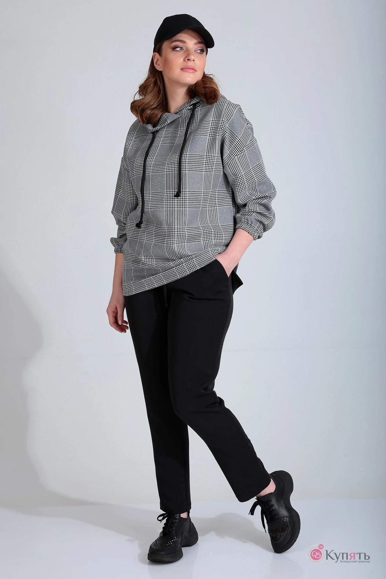 Костюм женский в стиле «спорт-шик» состоящий из джемпера и брюк. Джемпер прямого силуэта, со спущенной линией плеча. Низ рукавов джемпера на резинке. По низу спинки джемпера отрезная деталь с печатью. Горловина обработана капюшоном, состоящим из двух частей. В отлет капюшона вставлены блочки и декоративный шнур. Брюки зауженные к низу. На передних половинках брюк боковые карманы «хулиганы». Верхний срез брюк на притачном поясе на резинке с тесьмой из основной ткани.