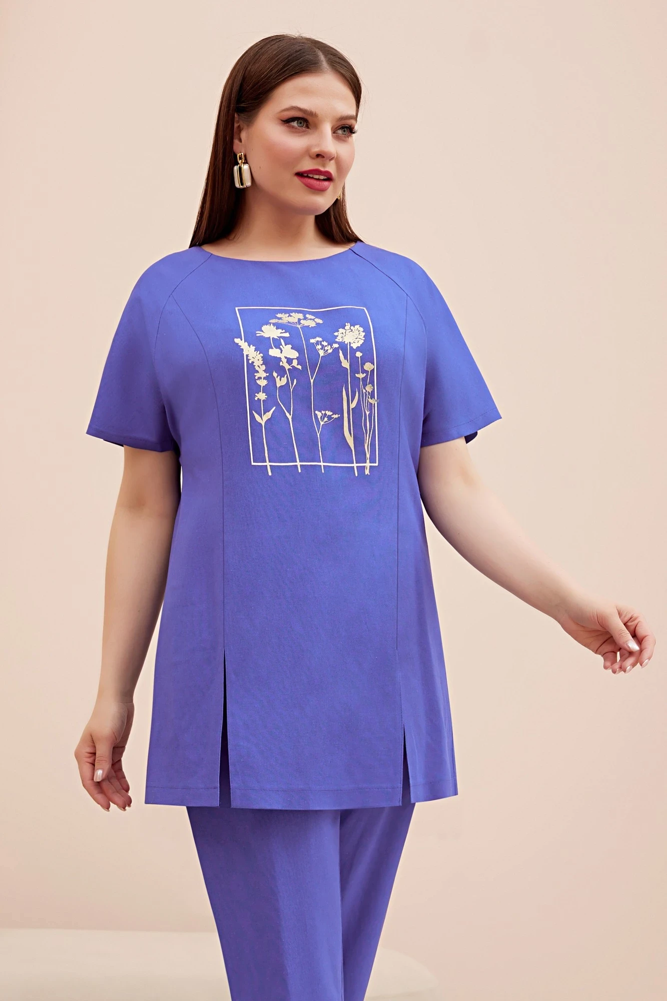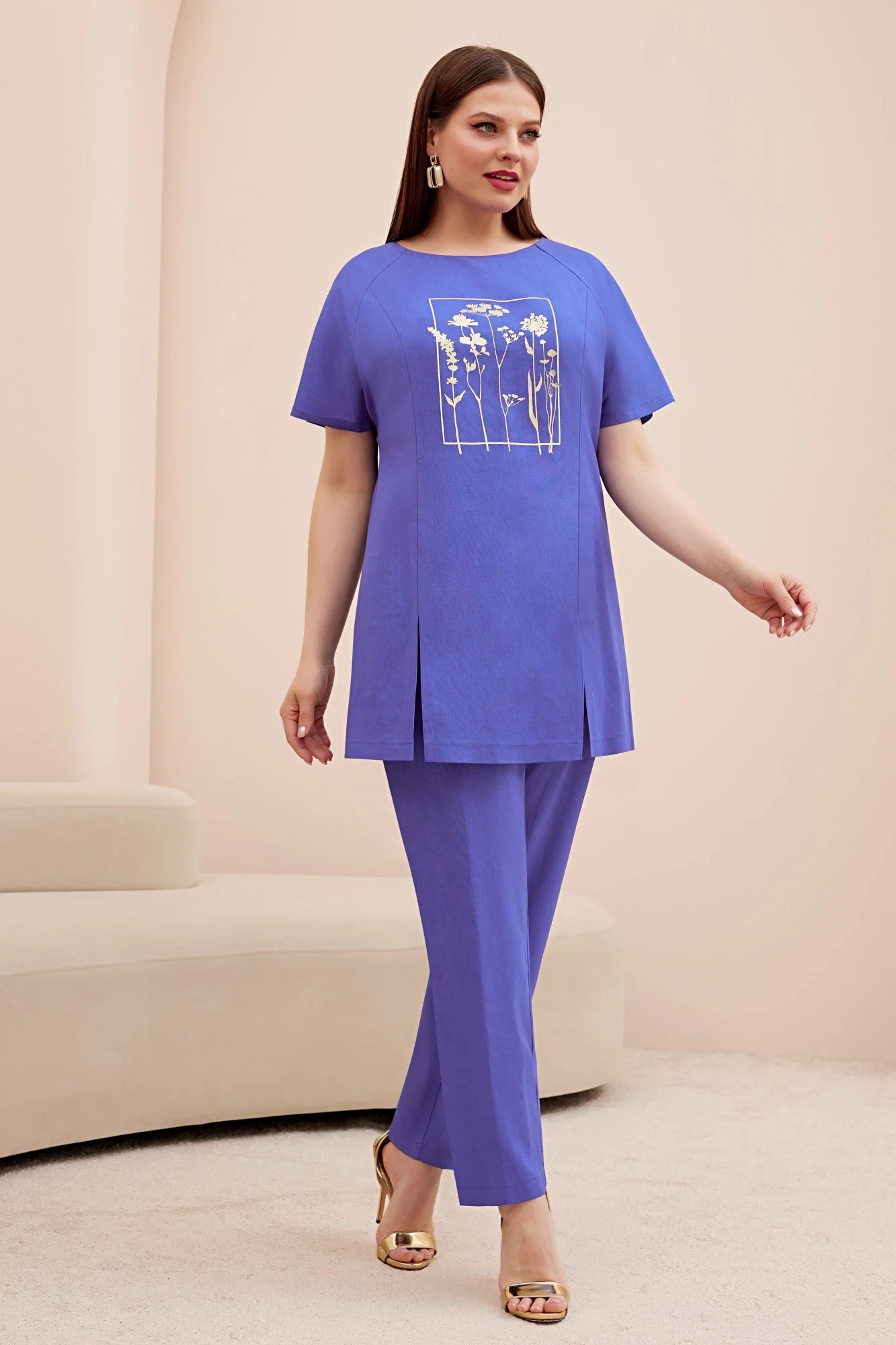 Дизайнерский комплект с авторским принтом и прямыми брюками горячий хит этого лета, отлично впишется в ваш гардероб легко сочетается со шпильками и обувью на плоском ходу. Лаконичный крой в сочетании с минималистичным дизайном зрительно заужает фигуру и вытягивает силуэт. Комплект состоит из прямых брюк и свитшота со спущенной линией плеча на основе реглановского покроя. Свитшот с округлым вырезом полуприлегающего силуэта на основе покроя реглан с вертикальными рельефами переходящими в разрезы. Перед украшен дизайнерским принтом, горловина округлая ближе к лодке. Спинка со средним швом и талиевыми вытачками, застежка на потайную молнию в среднем шве. Трендовые прямые брюки с косыми карманами и отрезным поясом на резинке must-have для современной женщины. Застежка обработана по классической технологии (гульфик с молнией и пуговица на поясе).