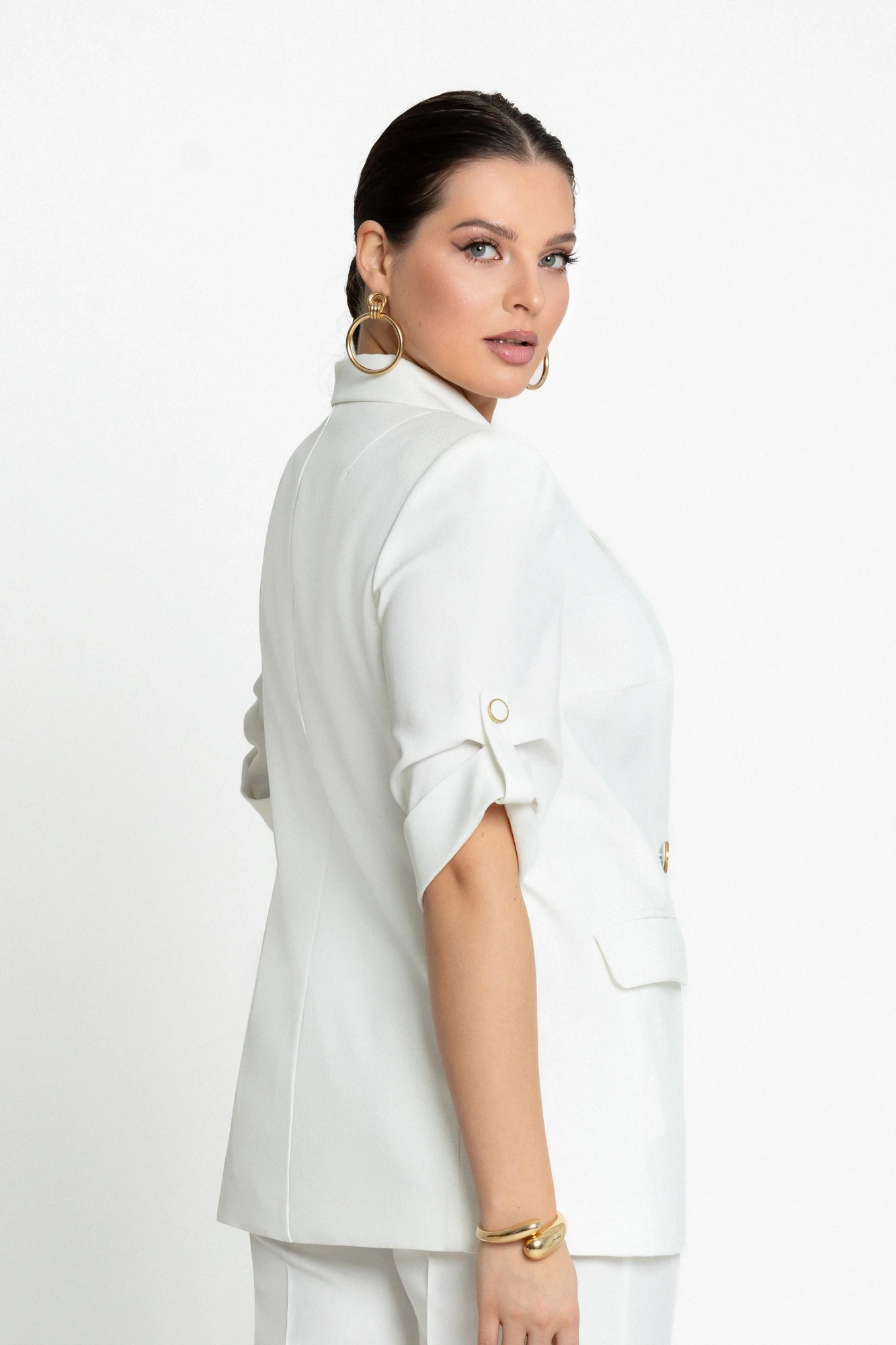 50,52,54,56,58Трендовый брючный костюм с широкими брюками и свободным двубортным жакетом настоящий хит. Двубортный жакет прямого силуэта мягкой формы с воротником пиджачного типа. Перед оформлен нагрудными вытачками из проймы и горизонтальными карманами в рамку с клапанами. Спинка со средним швом. Рукава втачные свободные с патами. Прямые широкие брюки средней посадки с отрезным поясом. В размерах 54,56,58 брюки с резинкой по талии. Застежка обработана как в брюках (гульфик с молнией и пуговица на поясе). Вся обработка выполнена как в классических итальянских костюмах перед и спинка жакета на х/б подкладке.