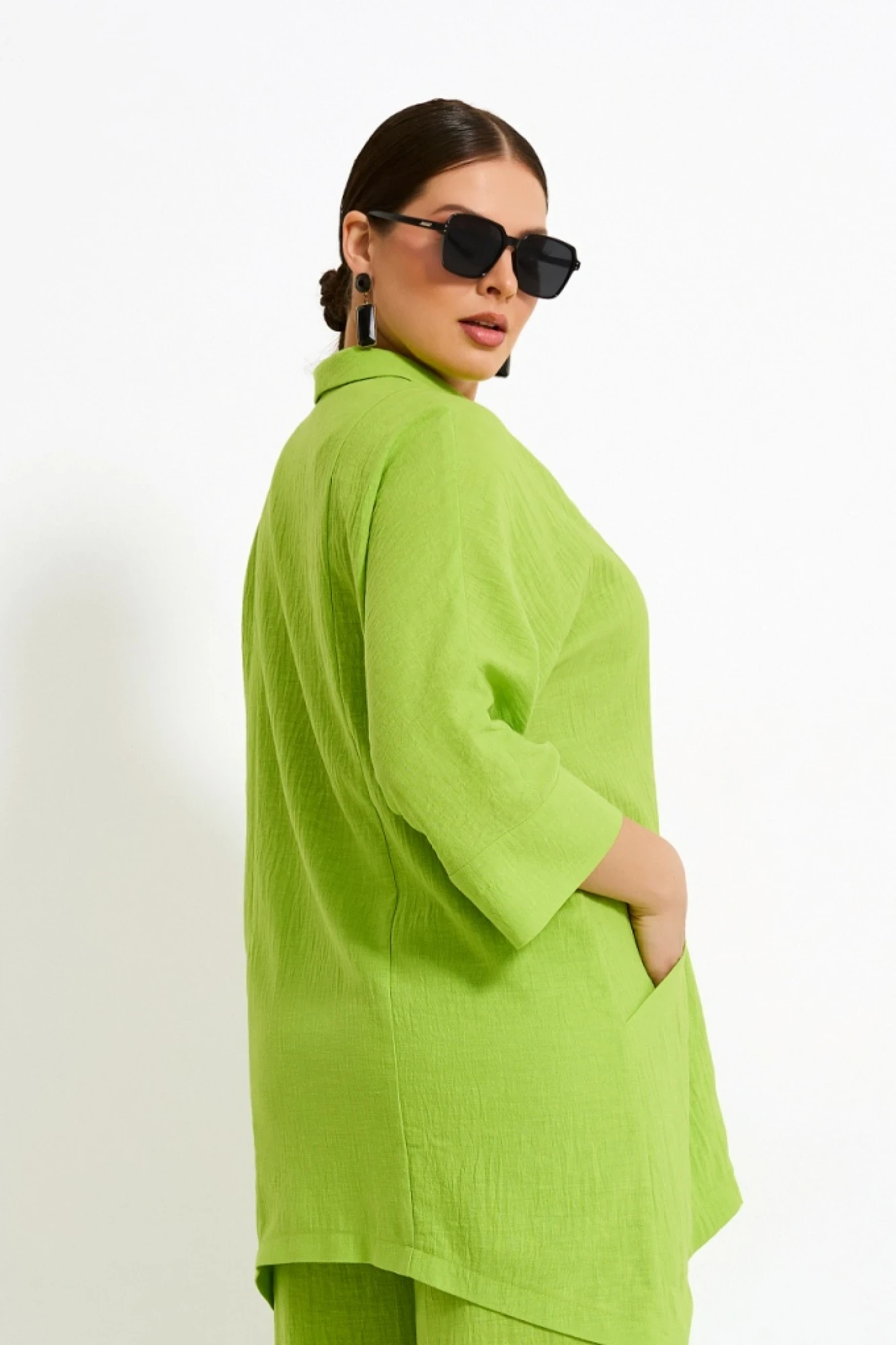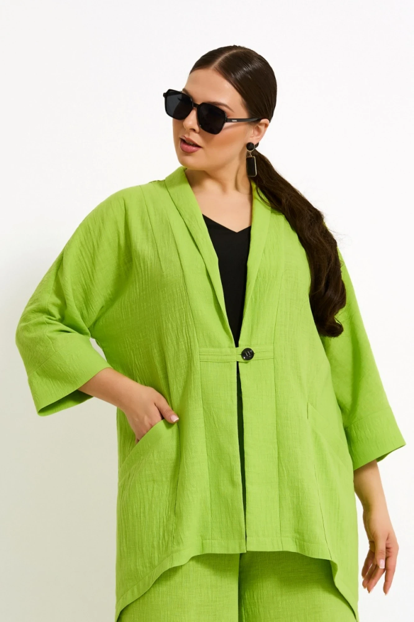 Жакет с воротником шаль и центральной застёжкой на петлю с пуговицей. Изделие с цельнокроеными рукавами и фигурным низом. Перед с карманами в нижней части. Спинка с двумя рельефами. Рукава с манжетами по низу.