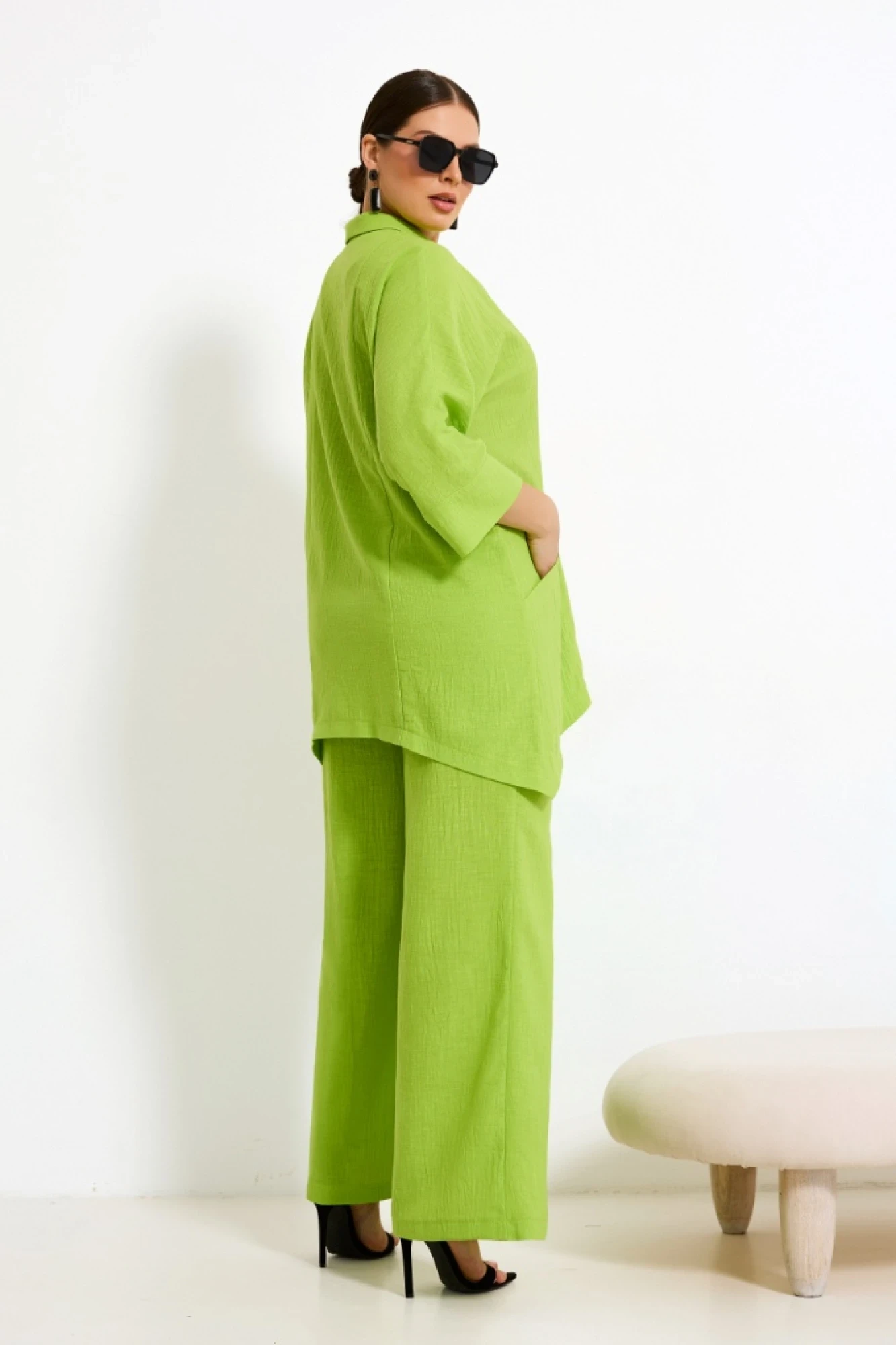 Брюки на поясе с резинкой и завязками по переду. Передние половинки с наклонными карманами к боковым швам.