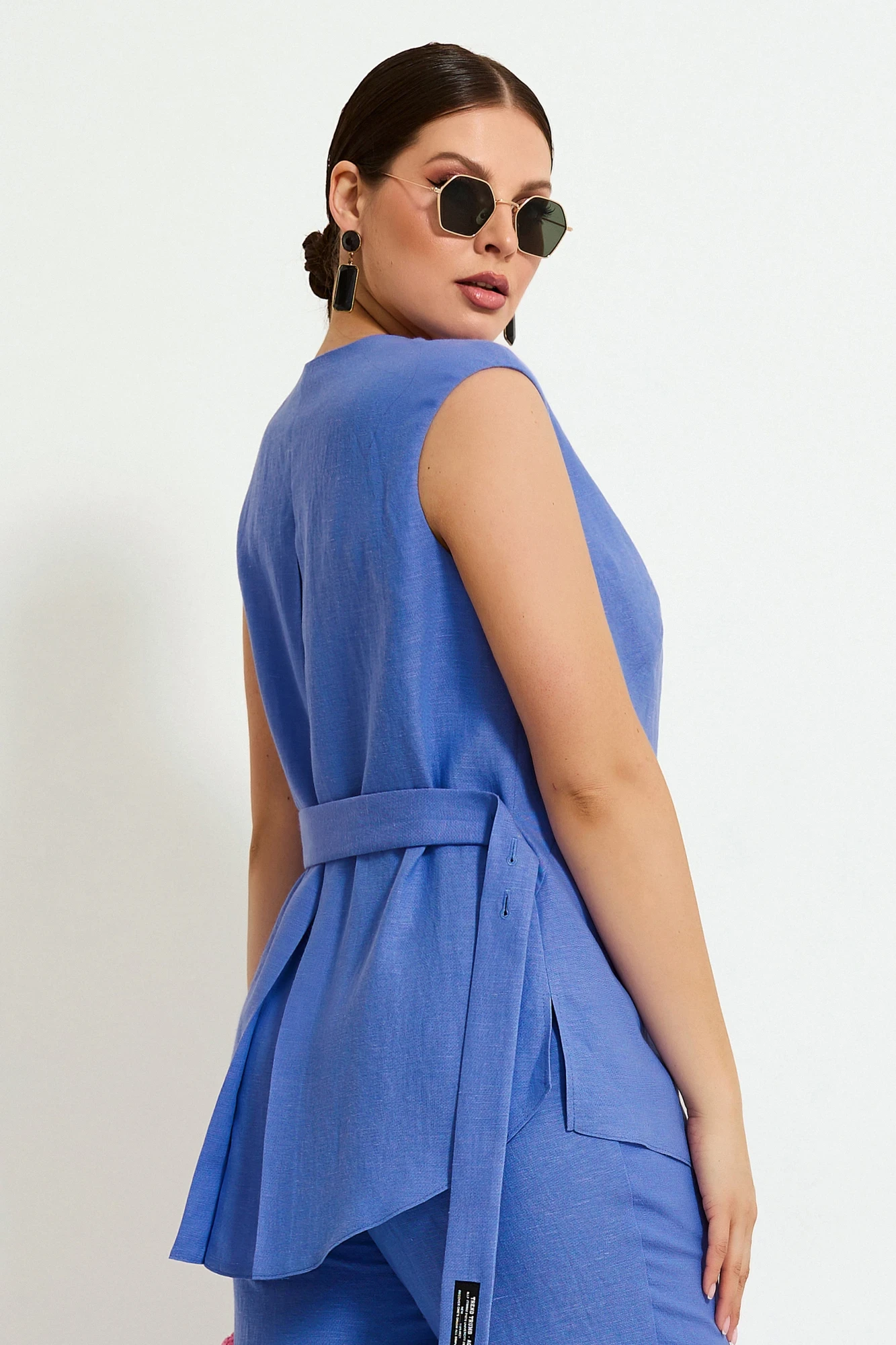 52, 54Жилет с фигурным вырезом горловины и ассиметричной застёжкой на петли и пуговицы. От борта с одной стороны на уровне талии расположен пояс, который застёгивается на петлю с пуговицей на спинке. Спинка со складкой по центру.