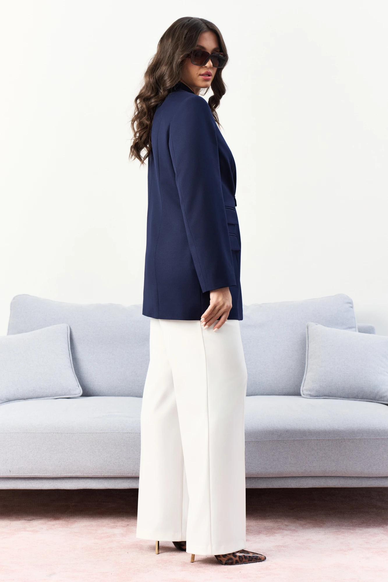 50, 52 ,54Жакет со стояче-отложным воротником пиджачного типа и смещённой застёжкой на пуговицу, в которую застёгивается и декоративная пата. Перед с карманом с клапаном в нижней части и декоративным клапаном. По переду идут два рельефа, один рельеф с разрезом в нижней части. Спинка со средним швом и двумя рельефами. Рукава втачные. Изделие на подкладке.
