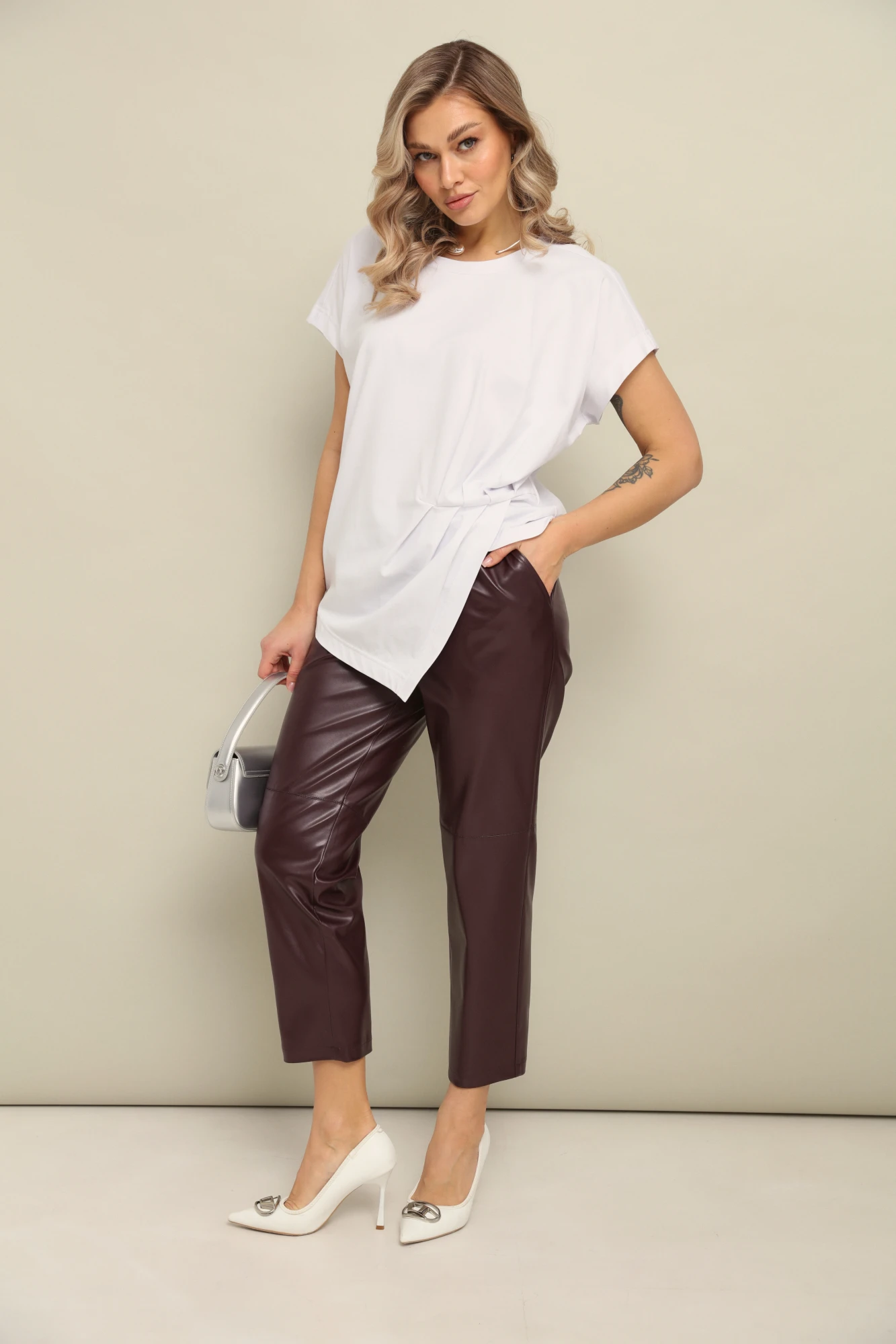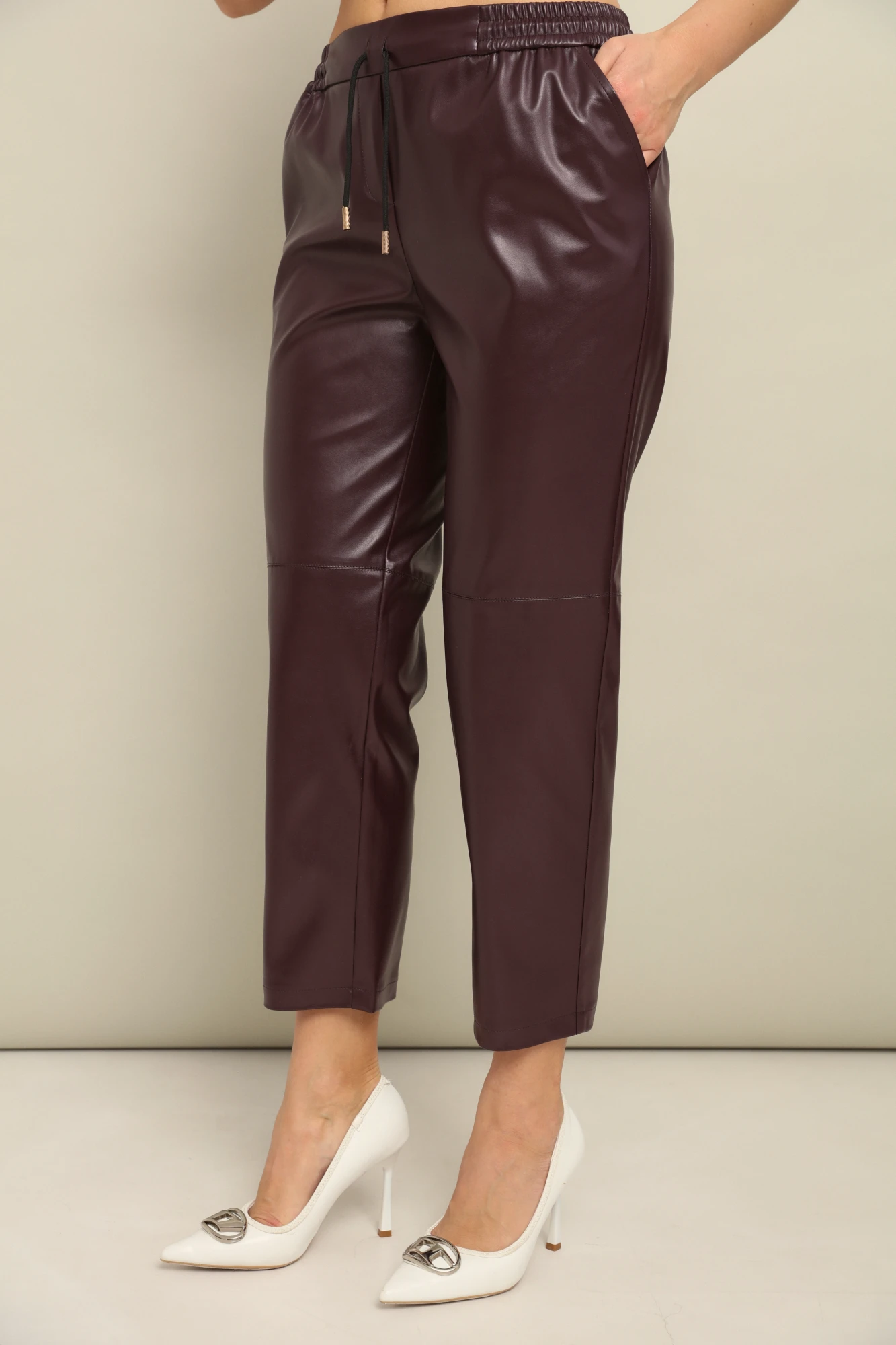 Зауженные брюки из эко кожи. Пояс на эластичной тесьме и втянутым шнурком. Вход в карман фигурный, наклонный к боковому шву.