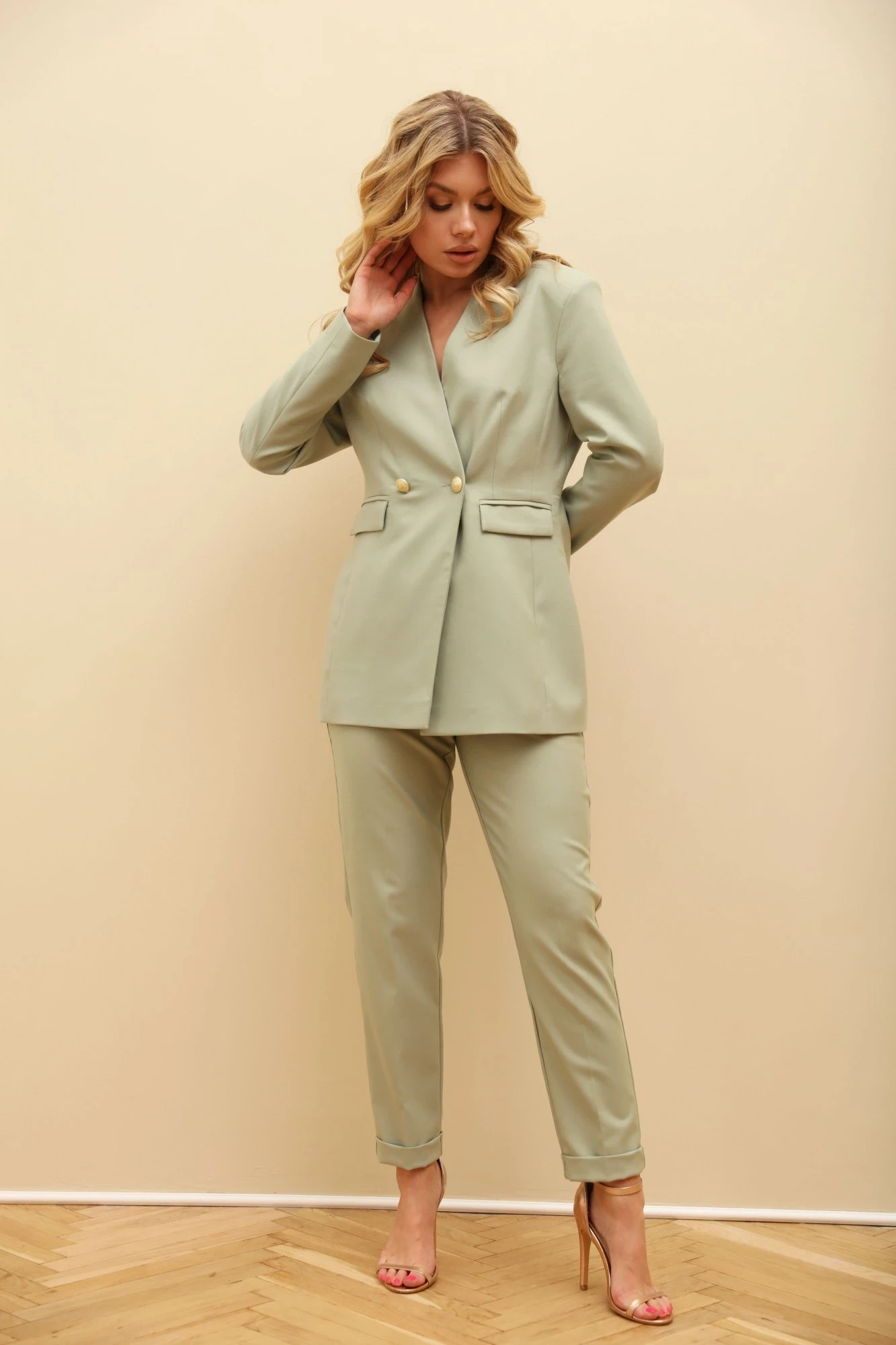 Двубортный жакет полуприлегающего силуэта с застёжкой на две пуговицы. Нагрудные вытачки на полочках расположены вертикально и совмещены с талиевыми, заканчиваются входом в карман. Карманы прорезные, в рамку с клапаном. Спинка имеет плечевые вытачки, средний шов со шлицей. Воротник – стойка переходит в край борта, имеющий V-образную форму. Застежка на прорезные петли и пуговицы. Жакет полностью обработан притачной подкладкой.