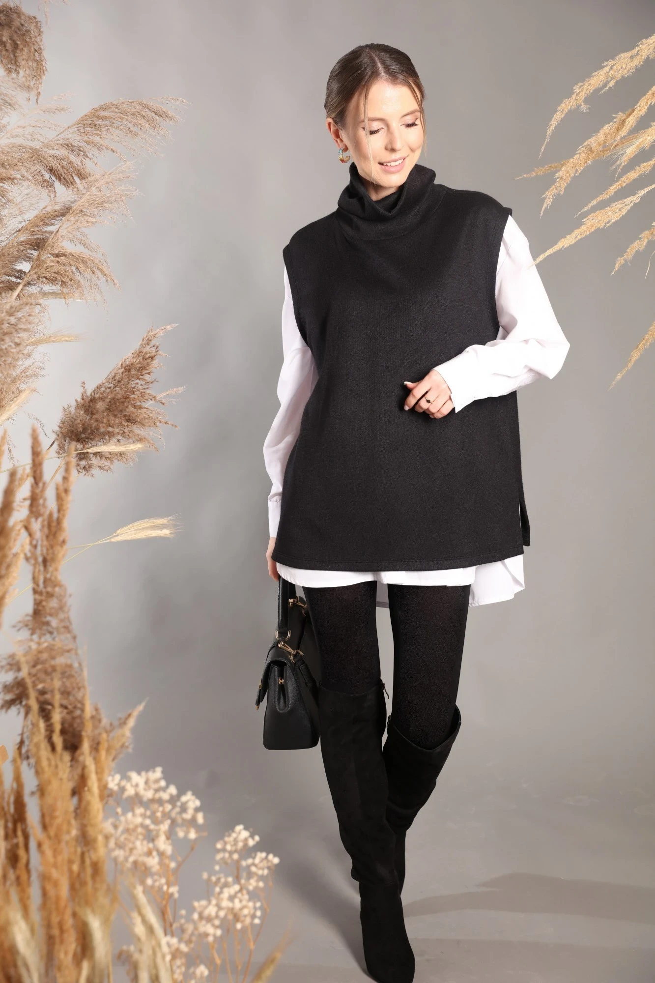 Жилет прямого силуэта, объёмного кроя. Горловина выполнена в форме хомута. Низ жилета прямой, по бокам декоративные разрезы.