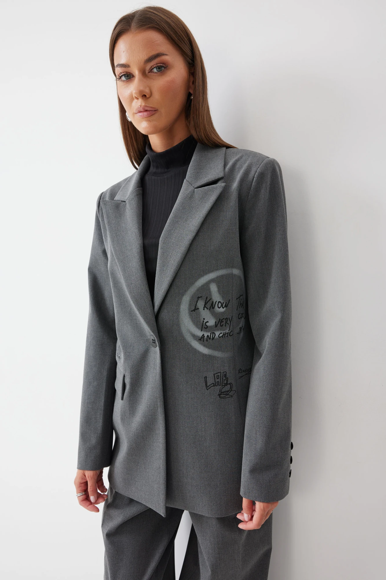 Жакет прямого силуэта из костюмной ткани. Воротник пиджачного типа с центральной застежкой на петлю и пуговицу. Рукав втачной двухшовный с декоративной шлицей и пуговицами. По переду и спинке талиевые вытачки. По переду карман с клапаном. По переду и спинке дизайнерская печать. Жакет на подкладке. Обращаем ваше внимание, что фурнитура может отличаться от фото.