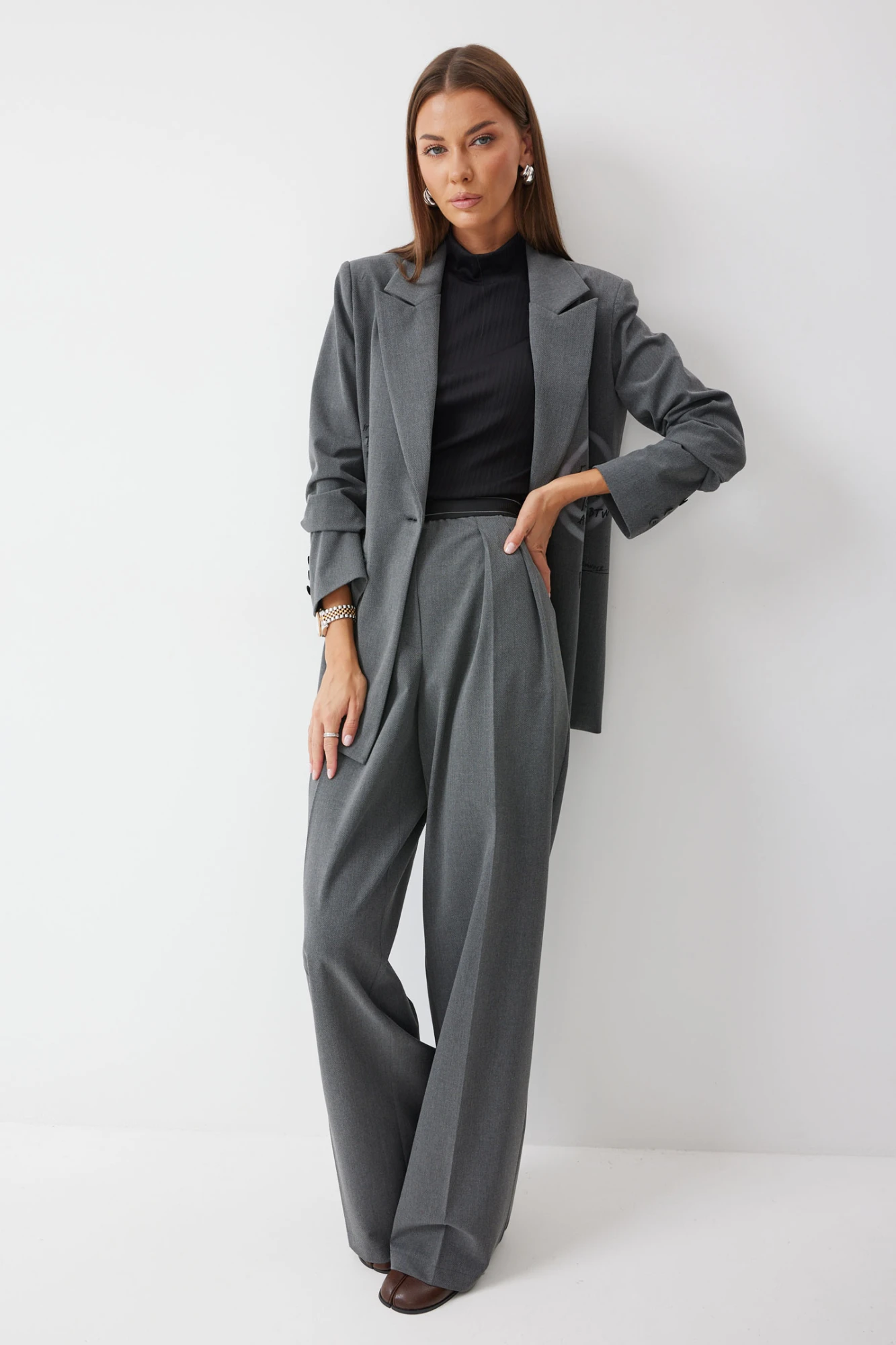 Брюки прямого силуэта из костюмной ткани. По верху брюк декоративная резинка. На передних половинках карманы и декоративные складки. На задних половинках вытачки. Обращаем ваше внимание, что фурнитура может отличаться от фото.