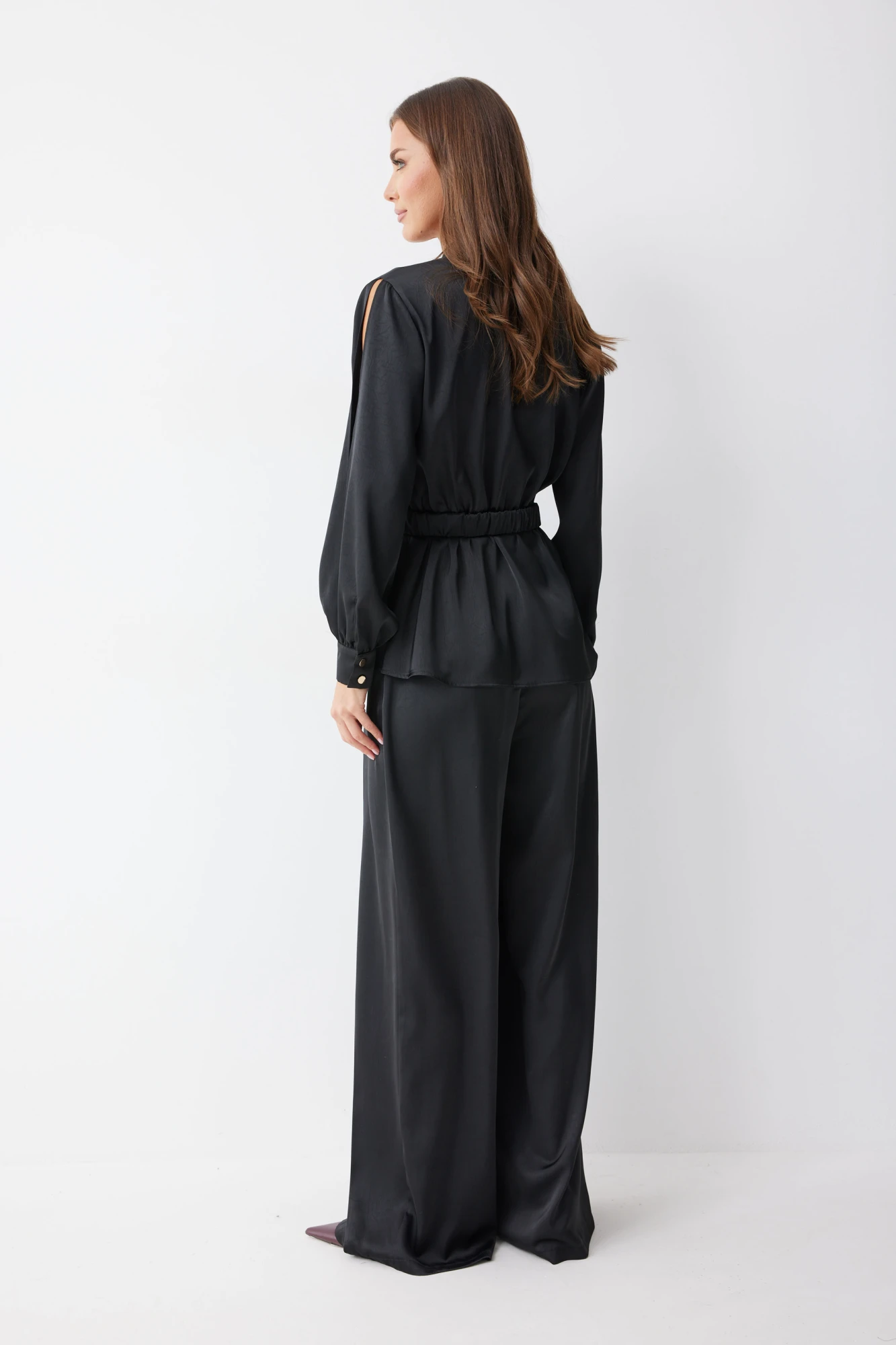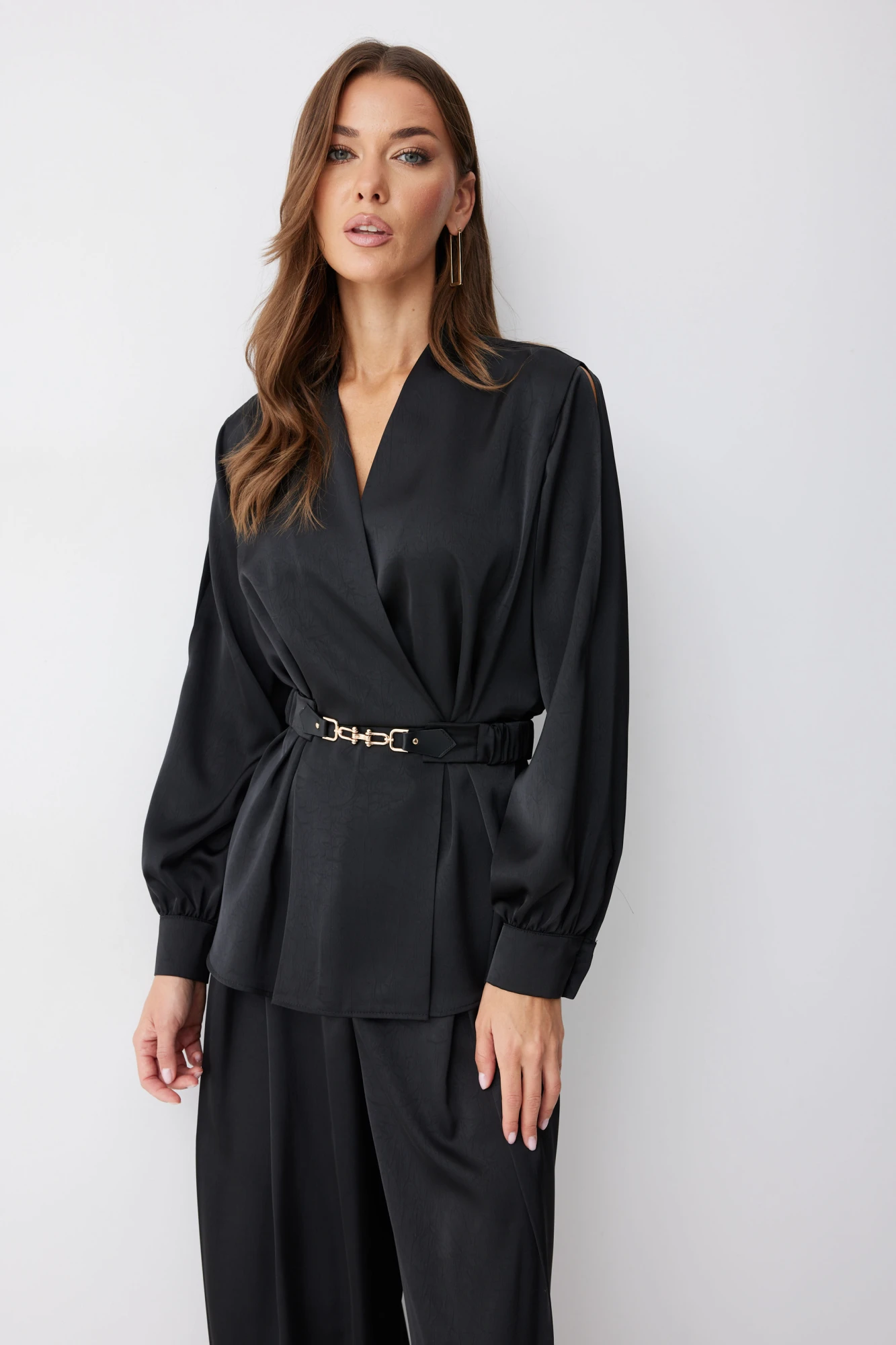 Блузка полуприлегающего силуэта расширенная книзу из струящейся ткани. Рукав втачной, с разрезом в области плеча, по низу манжета с застежкой на петли и пуговицы. Блузка отрезная по линии талии. По переду от подреза вверх и вниз декоративные складки. На спинке в подрез вставлена резинка. В комплект входит съемный ремень. Обращаем ваше внимание, что фурнитура может отличаться от фото.