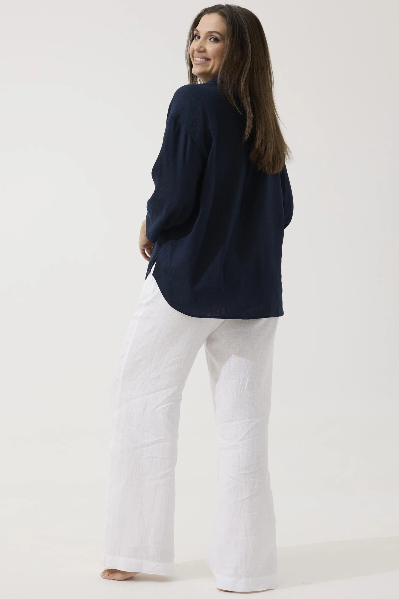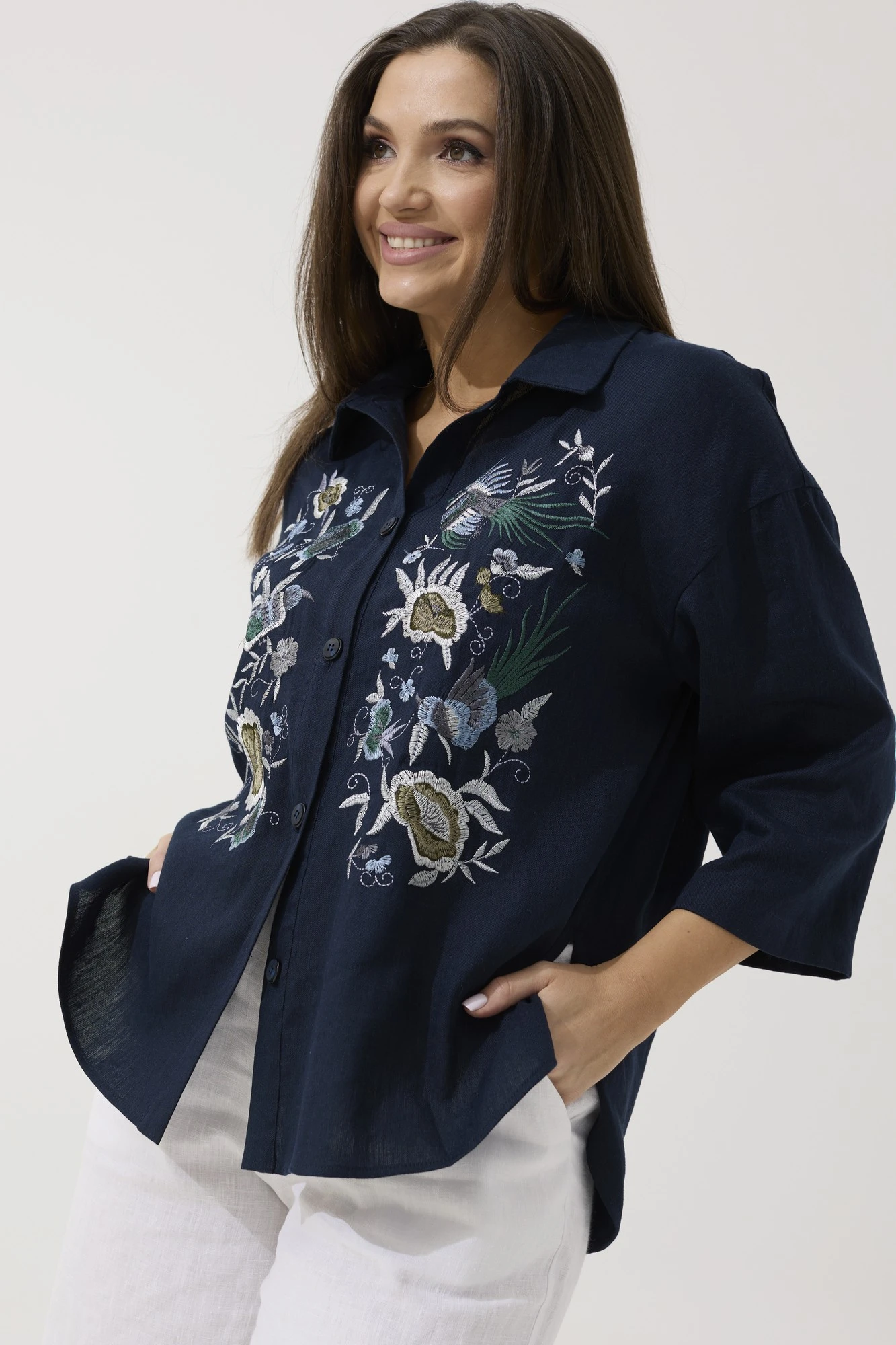 48,50, 52 , 54 ,56,58Рубашка свободного силуэта. Воротник отложной рубашечного типа. Застежка центральная на петли и пуговицы, спинка с кокеткой. На полочке расположены две симметричные дизайнерские вышивки. Рукав 3/4 со спущеной линией плеча, одношовный.