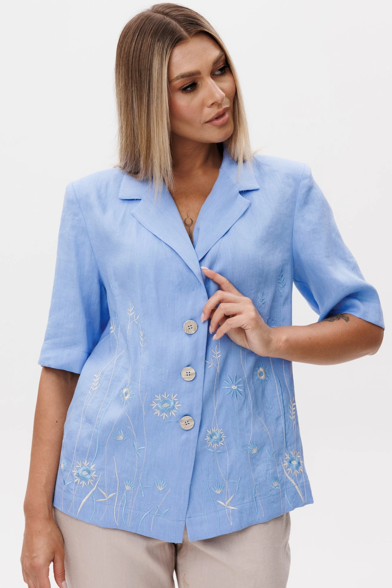 Жакет свободного силуэта. Воротник пиджачного типа, застежка центральная на три петли и пуговицы. Снизу полочки декоративная дизайнерская вышивка. Спинка со средним швом, который заканчивается шлицей. Рукав одношовный втачной, длиной по локоть.