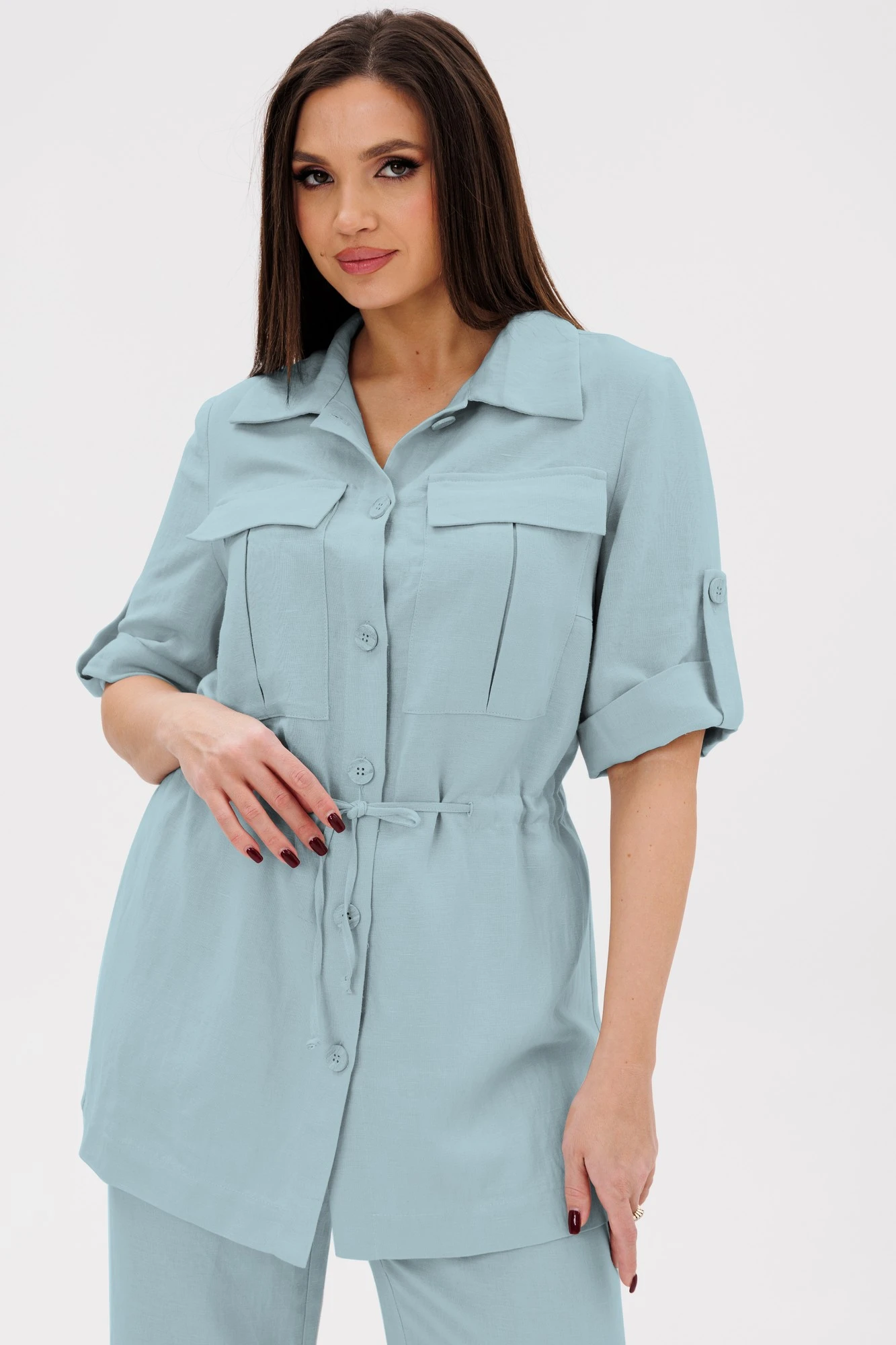Жакет свободного силуэта. Воротник отложной. Застежка центральная на петли и пуговицы. Перед с нагрудными вытачками и накладными карманами с клапанами. Спинка со средним швом. Рукав втачной одношовный длиной по локоть, низ рукава обработан манжетой. На рукав настрочера пата для регулирования длины. По линии талии выполнена кулиса с завязкой из основной ткани.