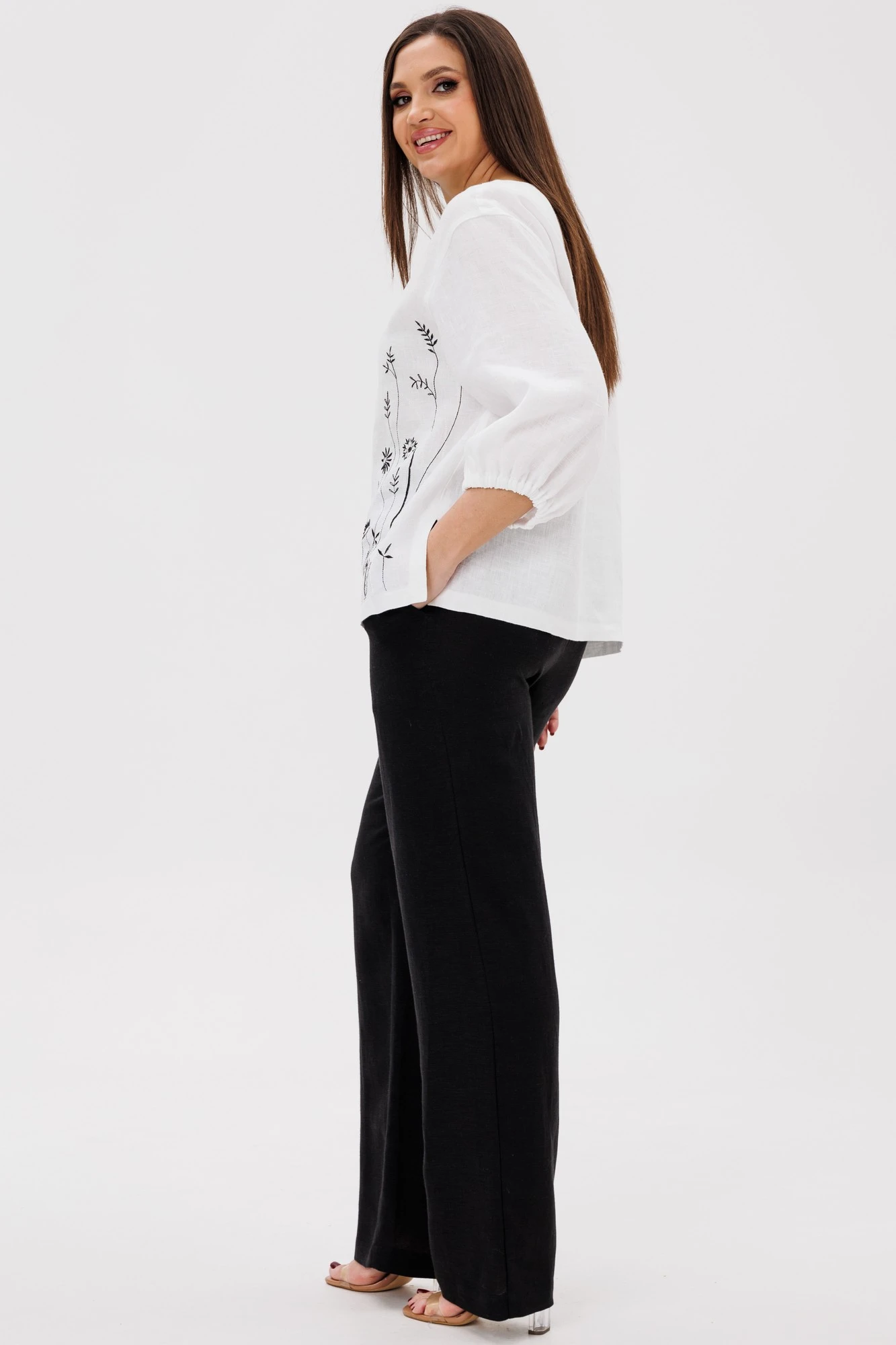 Блуза свободного силуэта. Горловина округлой формы, обработана обтачкой. Перед и спинка цельные. По переду выполнена декоративная дизайнерская вышивка. Рукав одношовный втачной, длиной 3/4. Низ рукава на резинке, линия плеча спущена. В боковых швах разрезы.