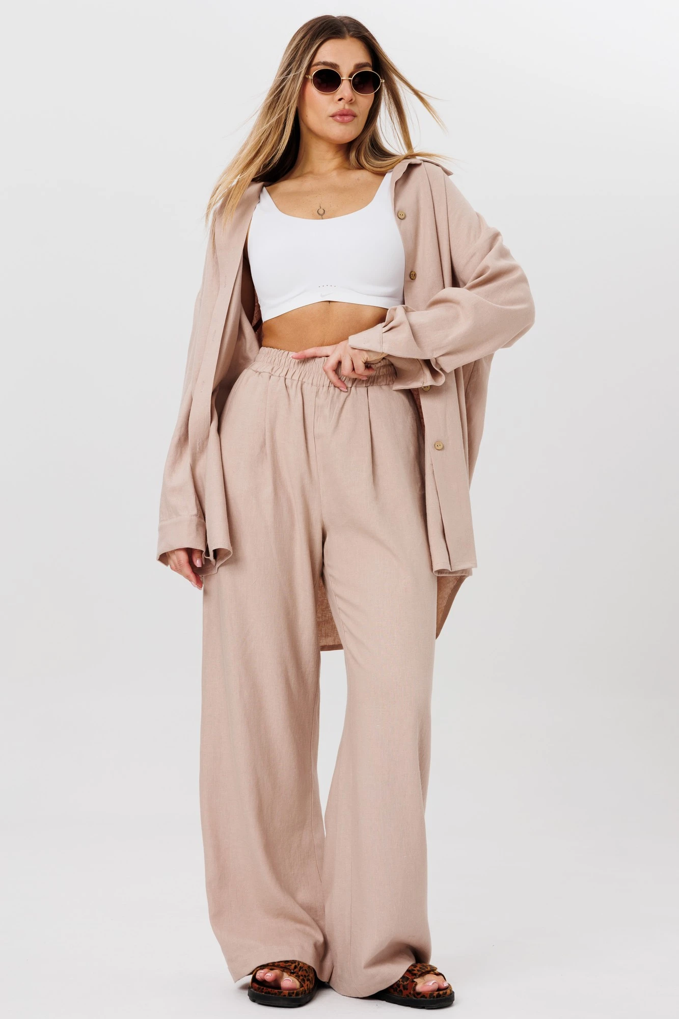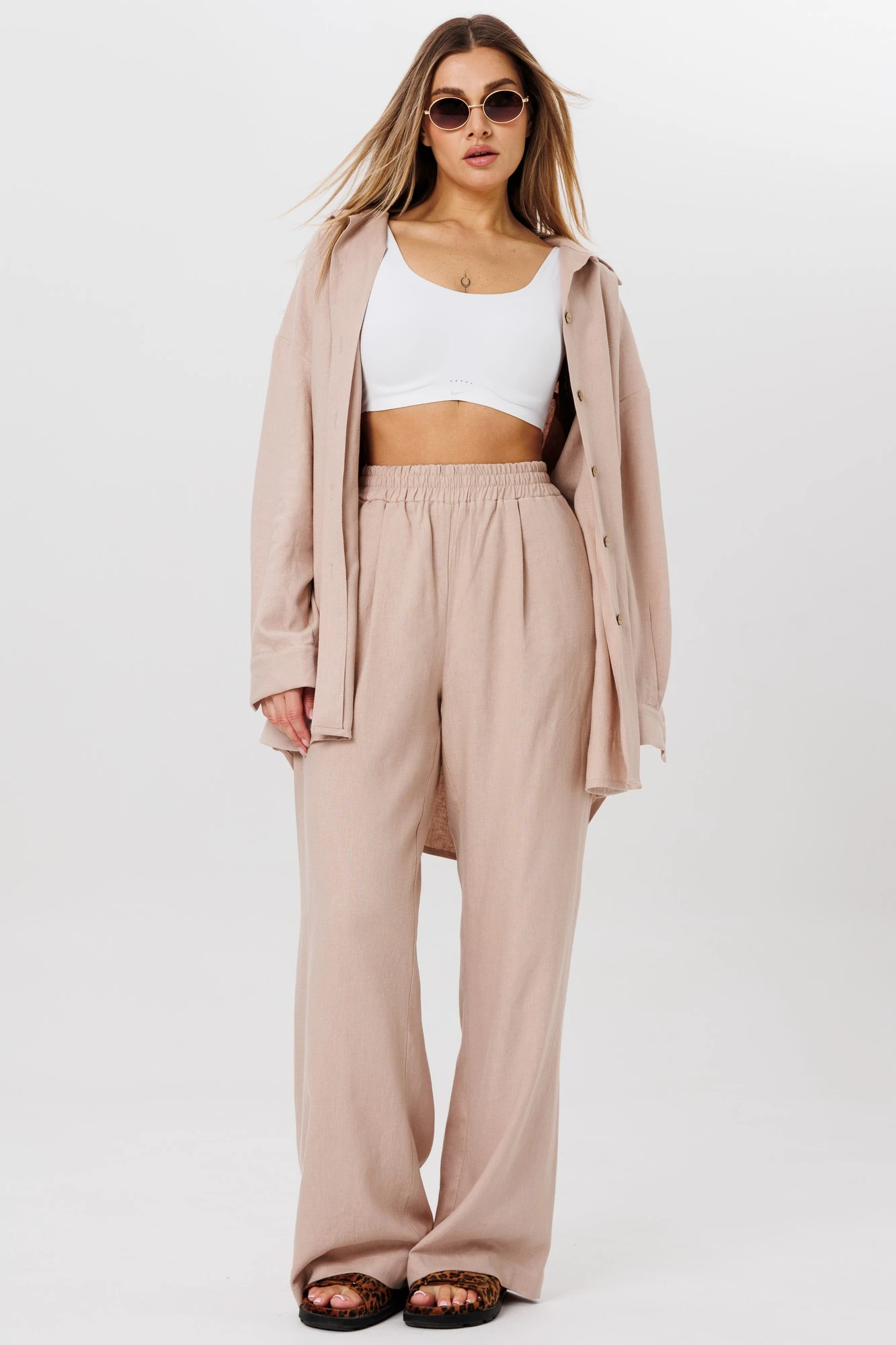 Брюки-палаццо. Пояс притачной на резинке. Передняя половинка брюк с функциональными карманами с диагональным входом.