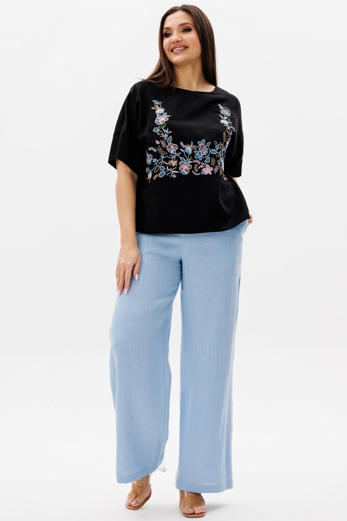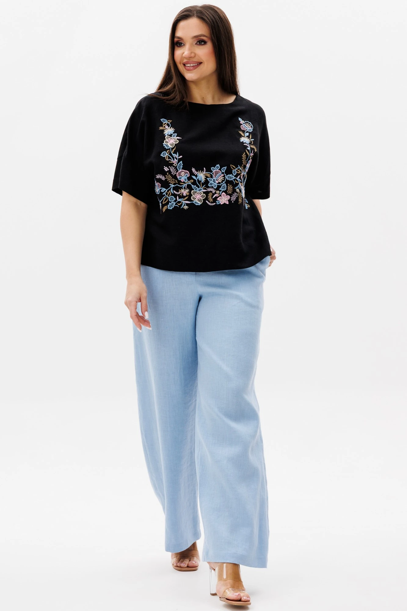 Блуза свободного силуэта. Горловина округлая, обработана обтачкой. Полочка цельная, на груди оригинальная дизайнерская вышивка. Спинка цельная, в боковых швах разрезы. Рукав по локоть, одношовный втачной, линия плеча спущена.