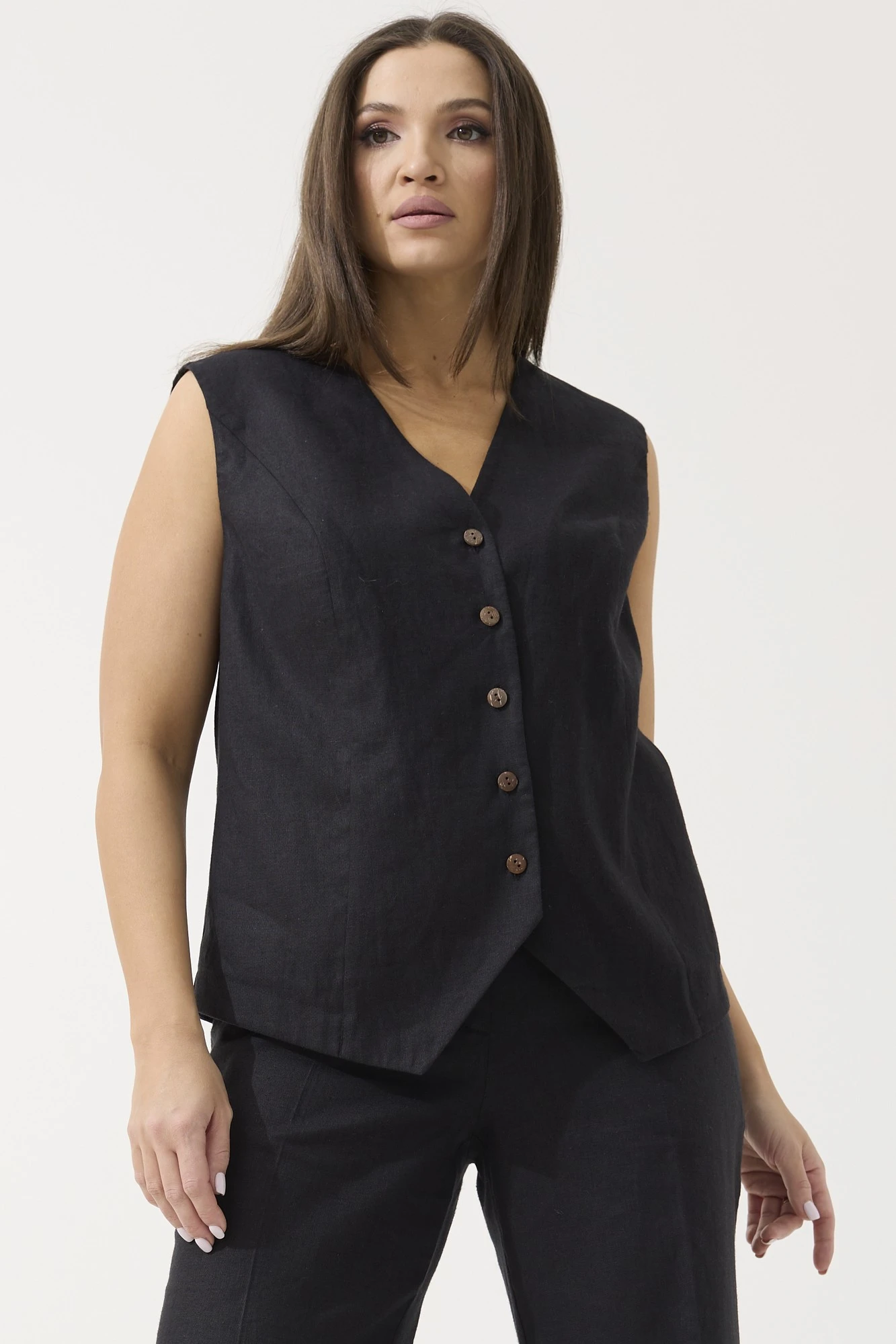 Комплект спасет вас в офисную жару, также идеален для прогулки с друзьями. Жилет, топ и брюки можно приобрести раздельно. Модели 1186, 1187 и 2088 соответственно.