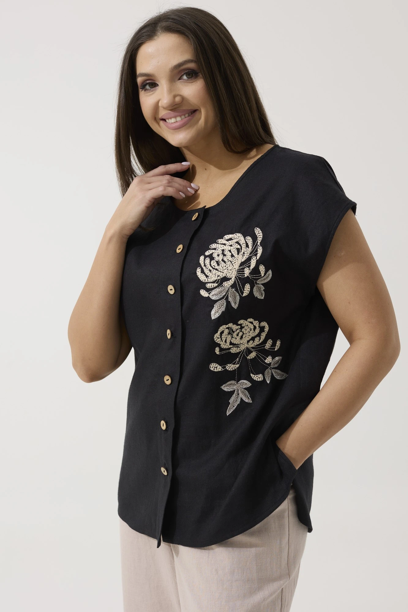 Блуза свободного силуэта. Вырез округлый. Застежка центральная на петли и пуговицы. По переду слева расположена дизайнерская вышивка ""хризантемы"". Спинка цельная, в боковых швах разрезы. Рукав короткий спущенный. Низ фигурный.