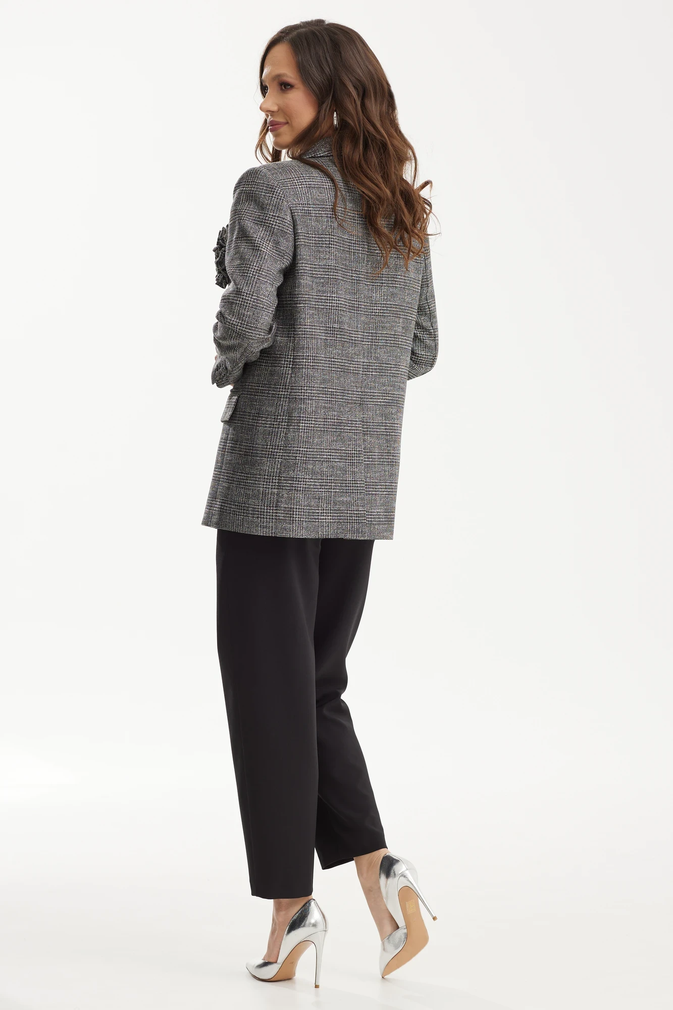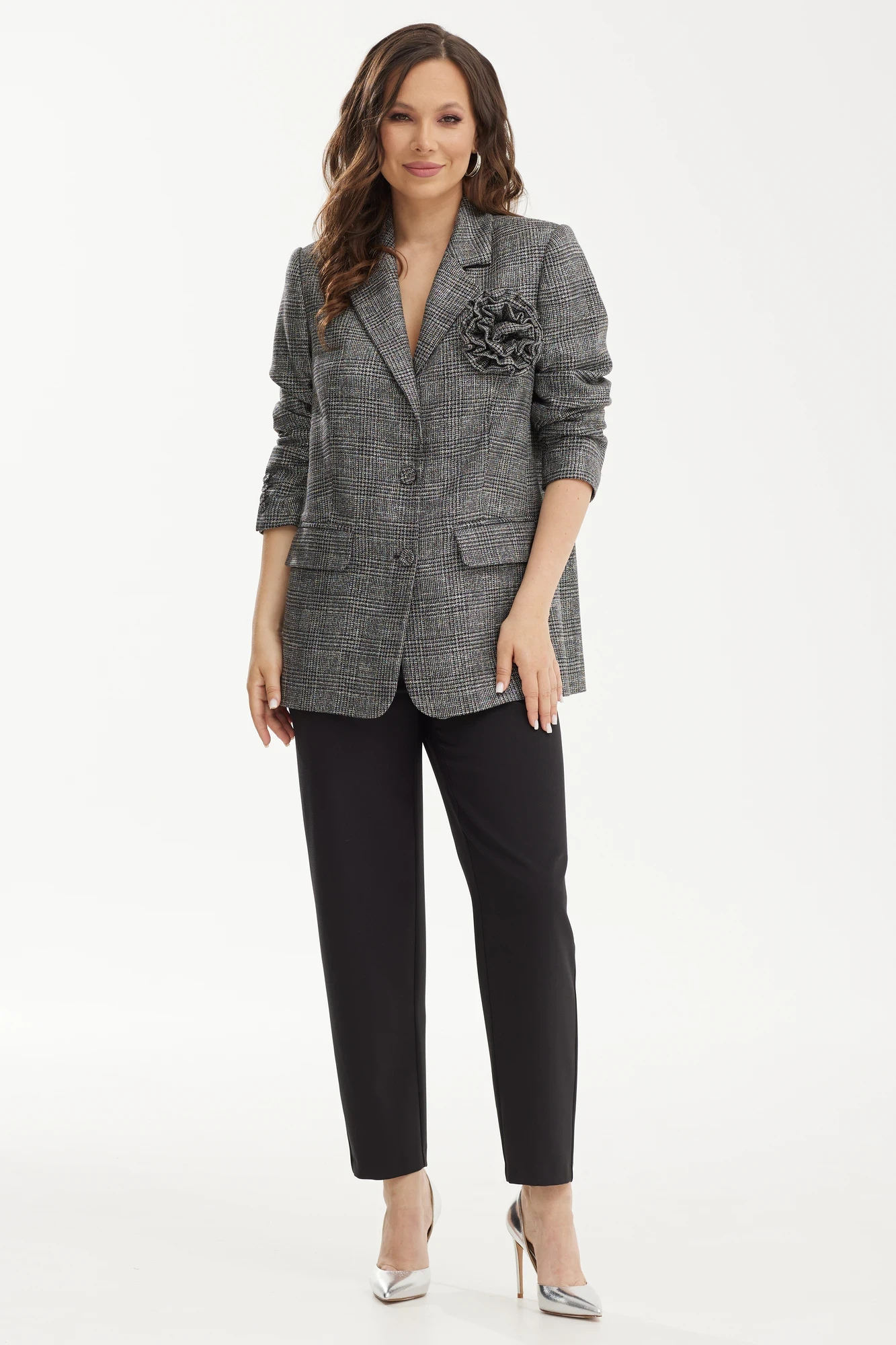 52,54,56Жакет прямого кроя, на подкладке. с центральной застежкой на пришивные пуговицы. Дополнен боковыми карманами с клапанами. Рукав втачной. Жакет украшен брошью ручной работы, выполненной из основной ткани. Брюки классического кроя с притачным поясом, дополненным эластичной тесьмой, с застежкой на пришивную пуговицу и молнию. К низу брюки слегка заужены. Посадка средняя. Дополнены функциональными боковыми карманами. Длина жакета от плечевого шва 70 см. Длина рукава 60 см. Длина брюк по боковому шву 97см.
