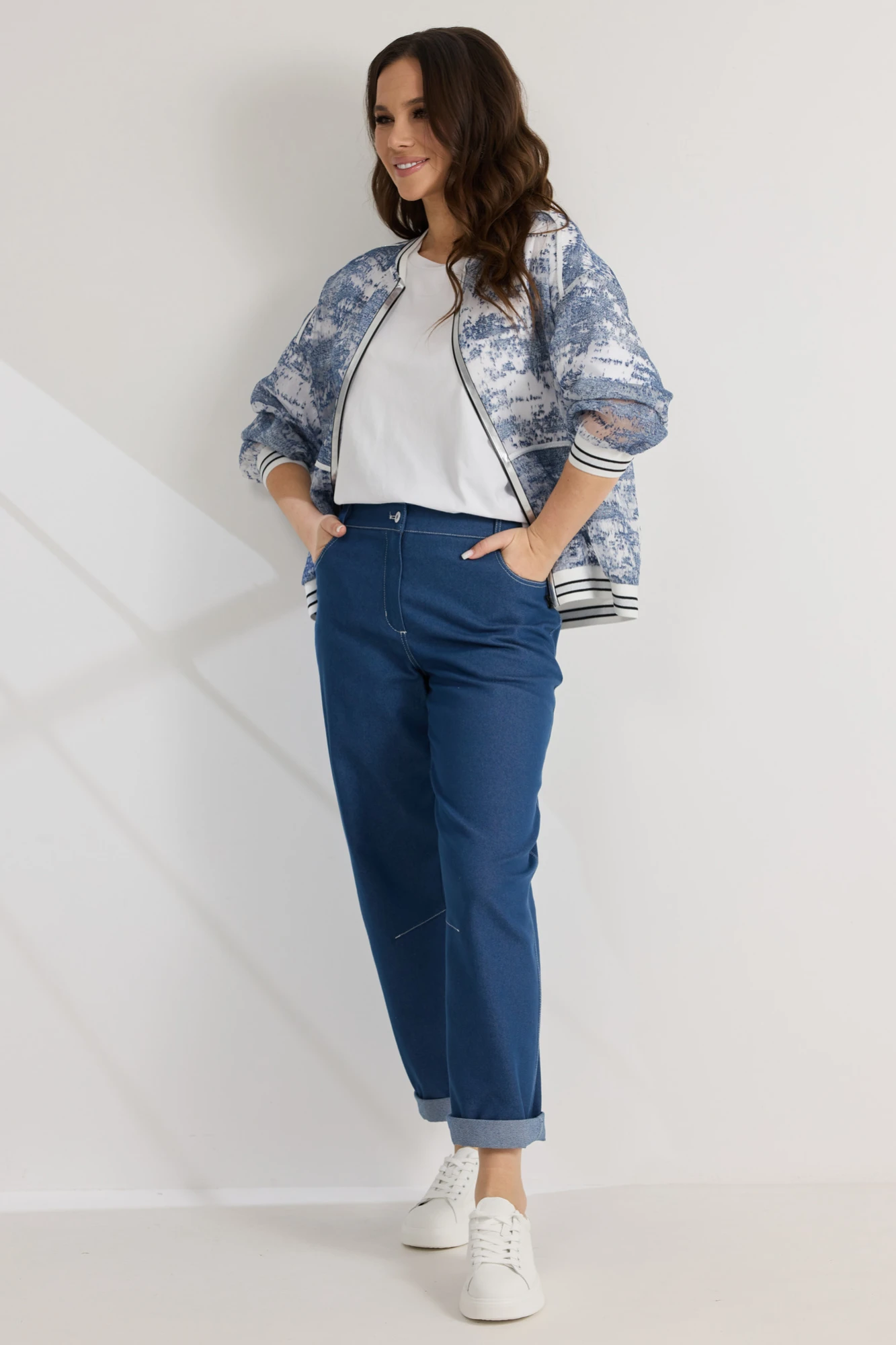 Брючный костюм Магия Моды 2558 бело-голубой+синий тройка