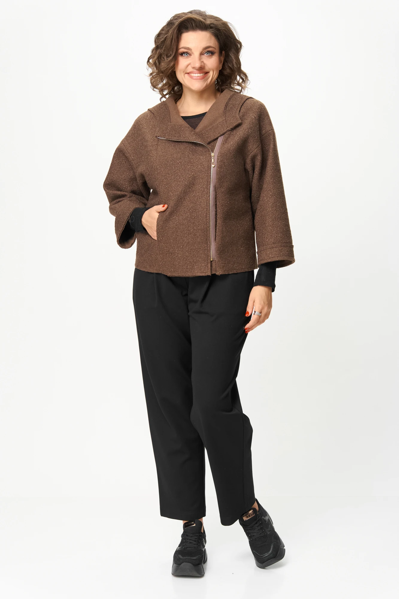 Курточка из букле — особая изюминка комплекта. Благодаря рукаву ¾ она универсальна: зимой её удобно носить в помещении как дополнительный слой, а весной, летом и осенью — как самостоятельную верхнюю одежду. Необработанные края придают образу модную лёгкую небрежность, а молния добавляет практичности и динамики.