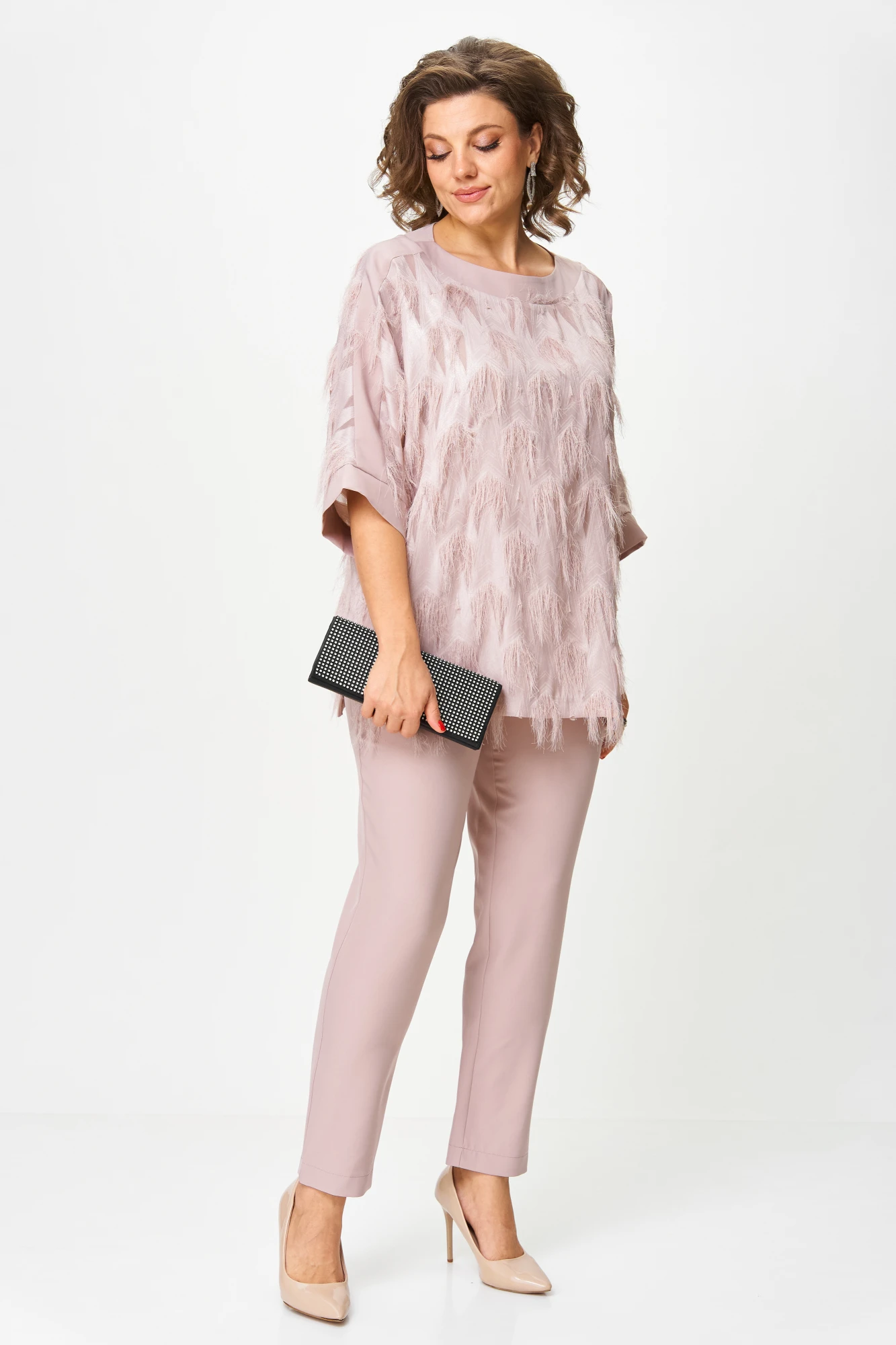 56, 58 , 60 , 62 , 64Элегантный комплект, в котором вы почувствуете себя богиней. Лёгкая блуза с фактурой «реснички» добавляет праздничного сияния и легко комбинируется с другими юбками или брюками. Универсальный цвет делает её идеальным спутником для любых образов. Брюки с удобной посадкой стройнят и подойдут не только для торжества, но и для повседневного стиля.