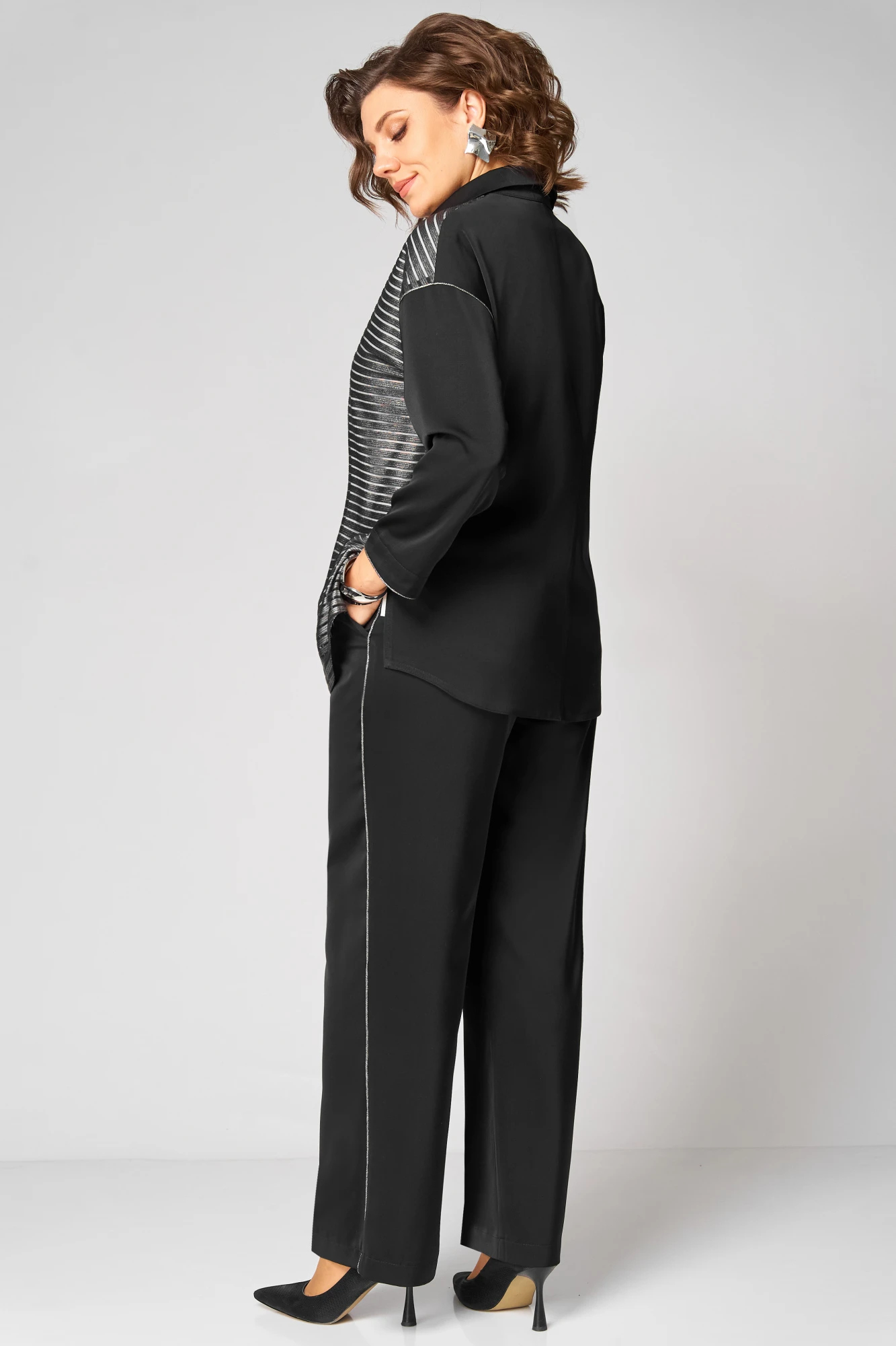 Топ с округлым вырезом горловины и спущенной линией плеча. Длина рукава от горловины-18см, длина по спинке-61см. Брюки прямого силуэта на притачном поясе с эластичной резинкой, с боковыми наклонными карманами на передних половинках брюк. По боковым швам настрочен кант.