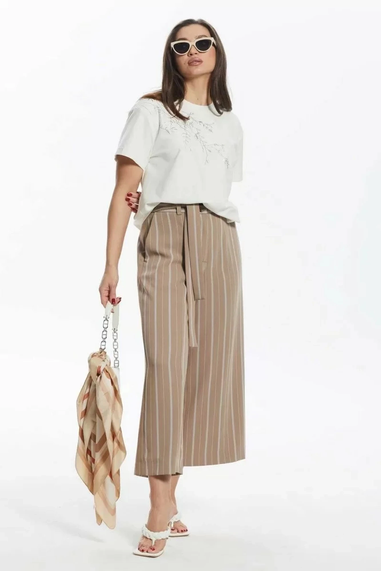 Брюки широкие прямые с высокой посадкой(кюлоты) до середины голени. Брюки на притачном поясе с функциональными боковыми карманами и застёжкой на потайную молнию с гульфиком и откоском. По спинке талевые вытачки. Дополнением служит пояс.