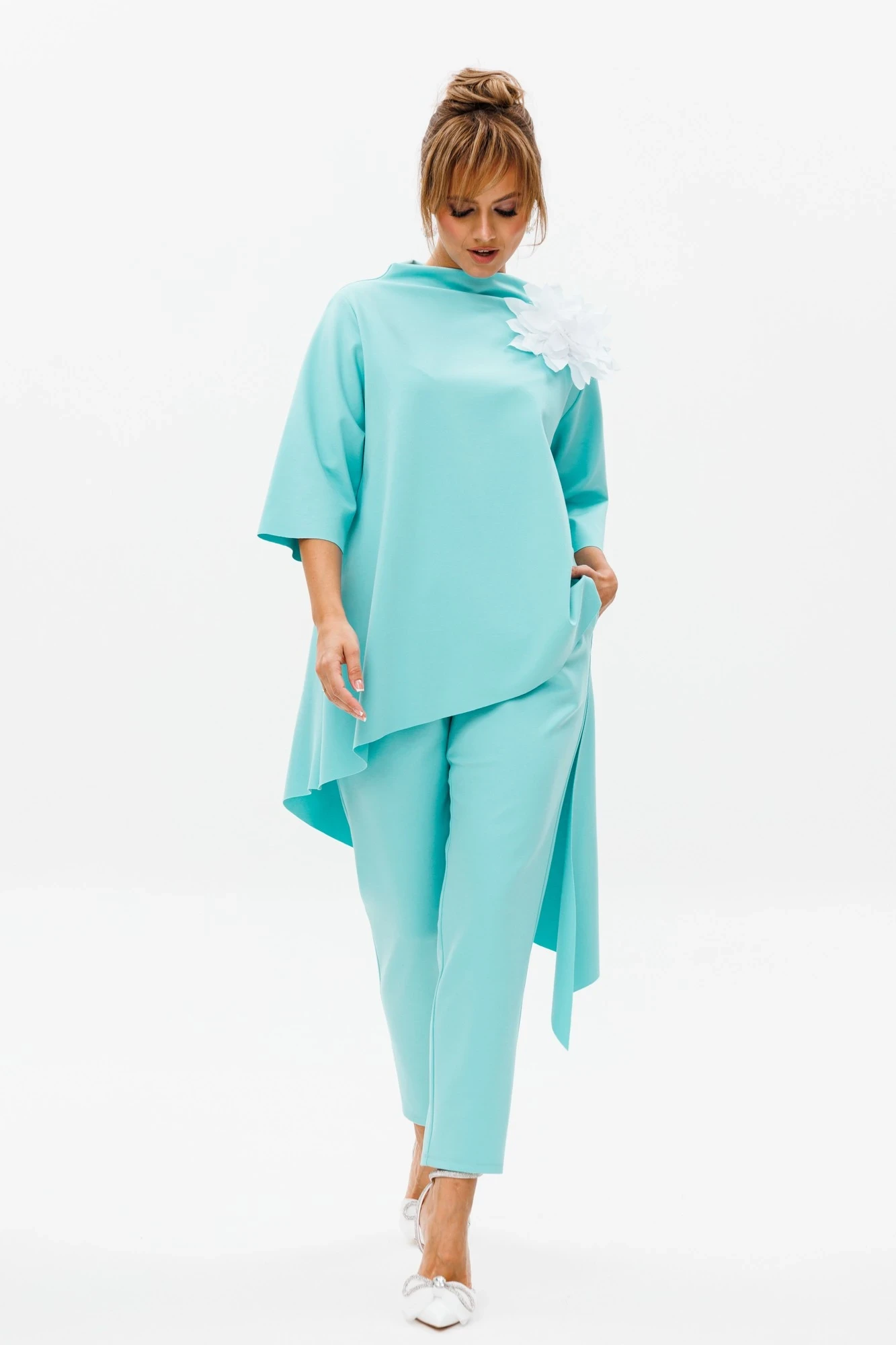 48,50,52, 54 , 56 , 58Блузон А-образного силуэта с ассиметричным низом. Перед цельный. Спинка со средним швом. Горловина оформлена цельновыкроенной стойкой. Рукав втачной, одношовный.