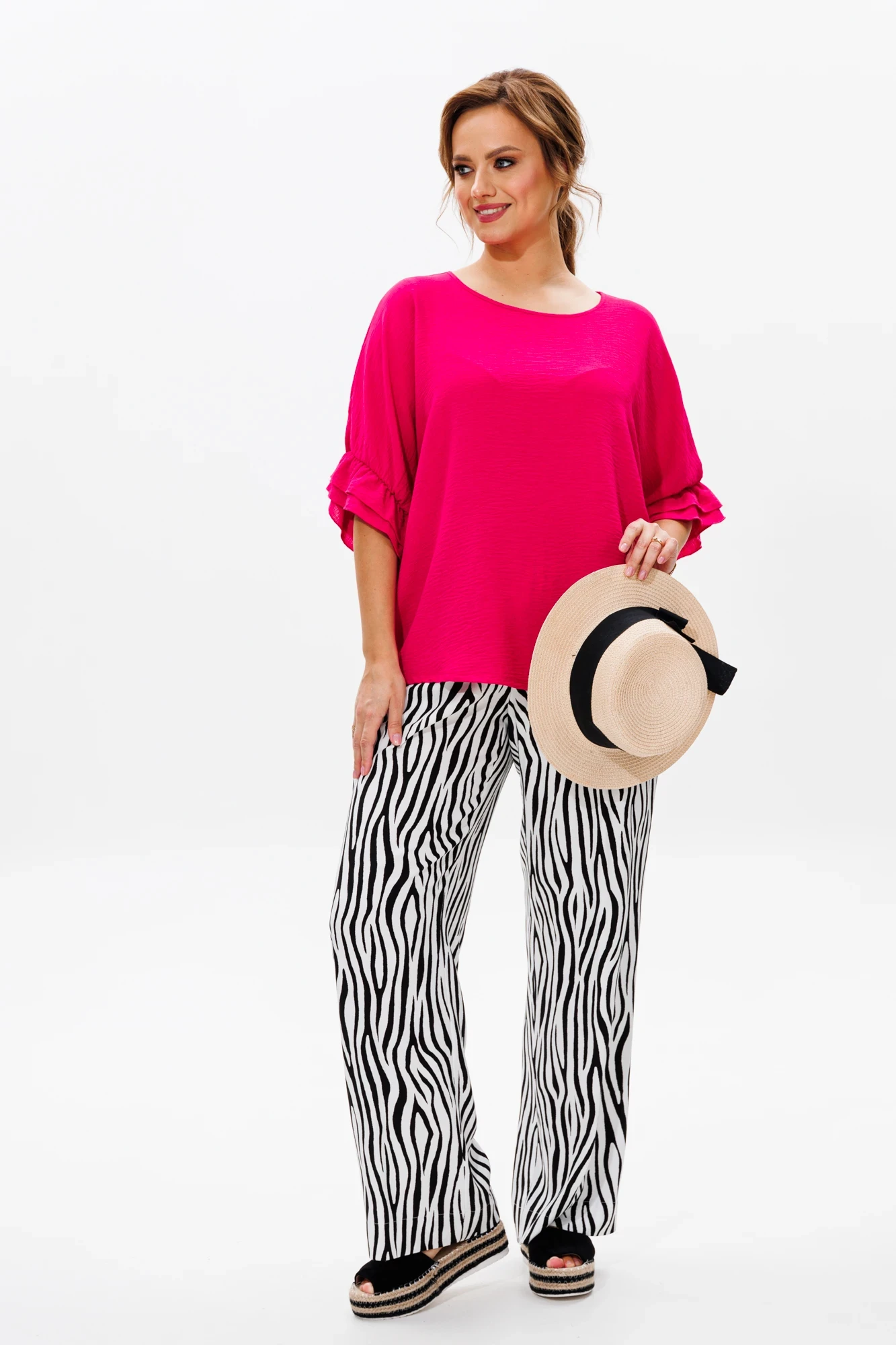 48, 50 , 52 , 54 ,56,58Блуза прямого свободного силуэта со спущенной линией плеча, выполненная из блузочной ткани (тянется). Горловина округлой формы, обработана окантовкой. Спинка со средним швом. Низ рукава оформлен двумя волонами, присборенными на резинку.